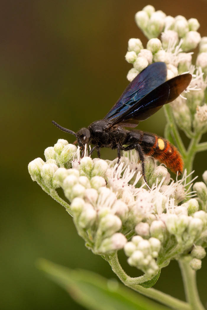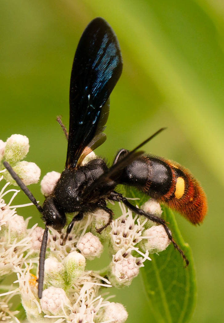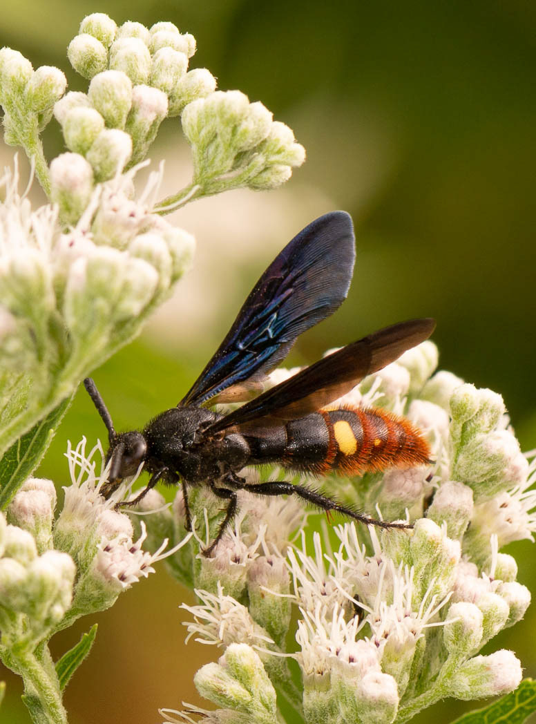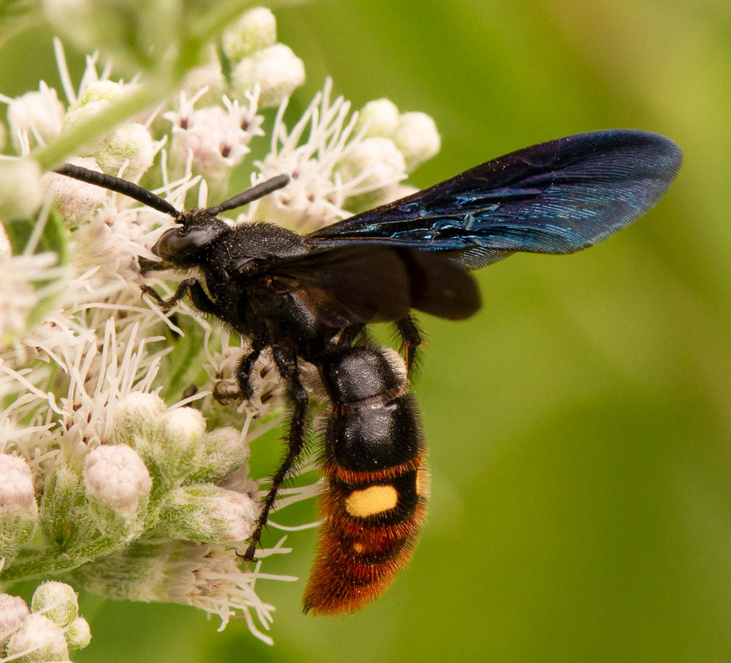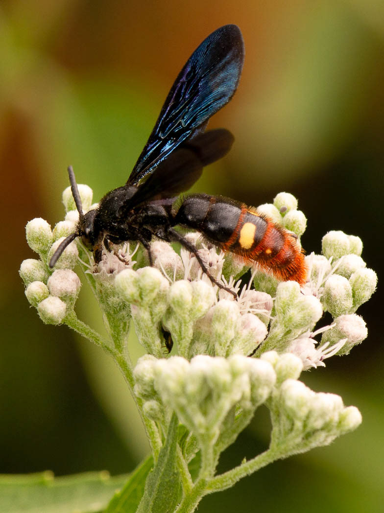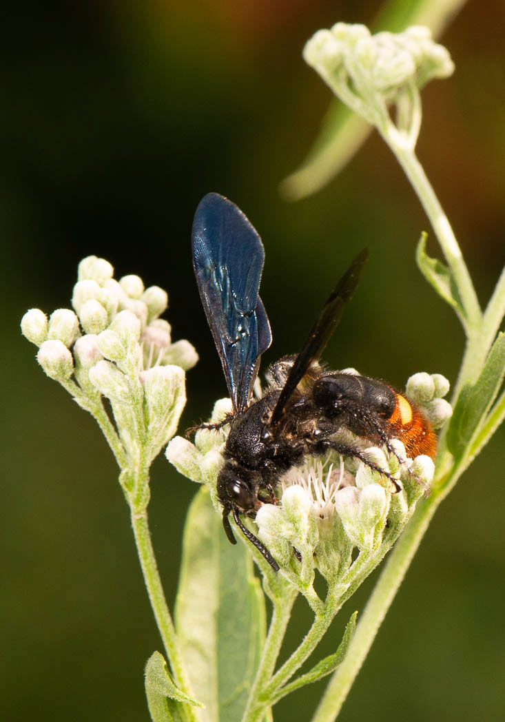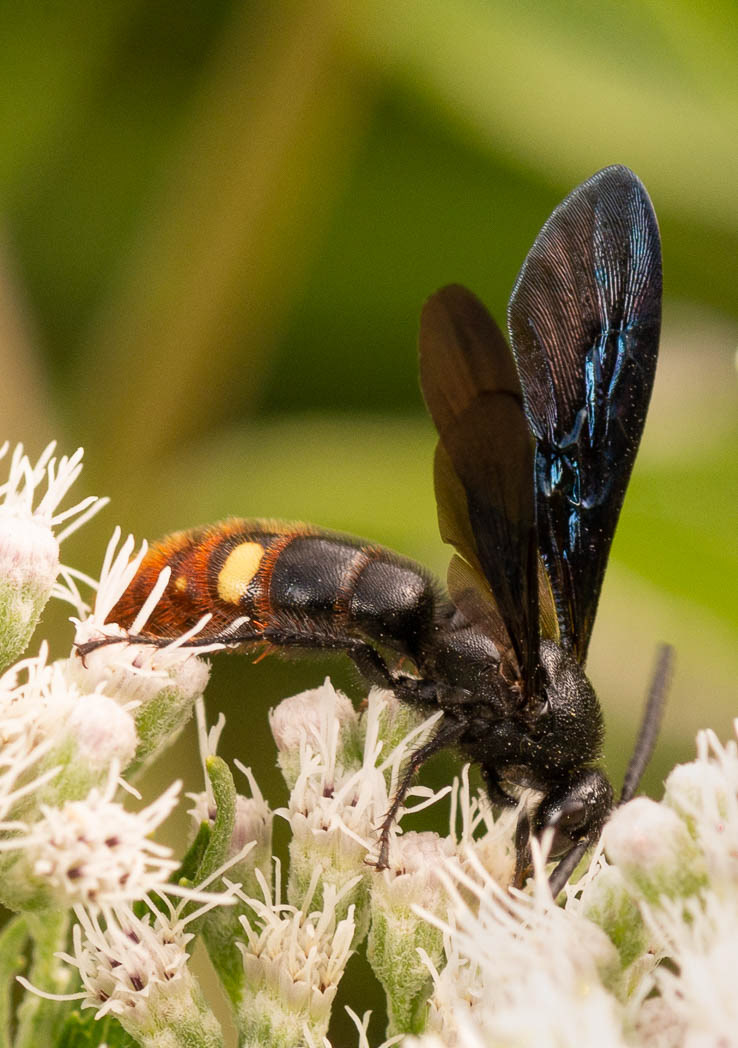 The Blue-Winged Wasp (Scolia dubia) is one of the Scolid wasps, a species that hunts beetles to nourish its larva. There are approximately 20 varieties of Scolid wasps in North America. This one digs in the ground to find grubs of several kinds of beetles including the Scarab, June, and Japanese beetles. The female paralyzes the grub with her stinger and then often digs the same hole deeper and makes a chamber where she places the grub and lays an egg on it. The larva that hatches then feeds on the grub. The adults feed on nectar. A native species, they range widely in the United States. They do not sting people unless molested and are a boon to gardeners.