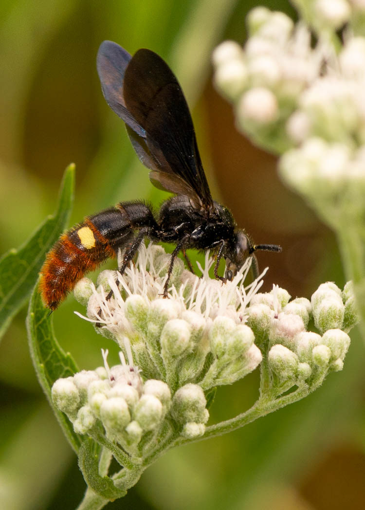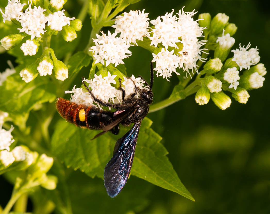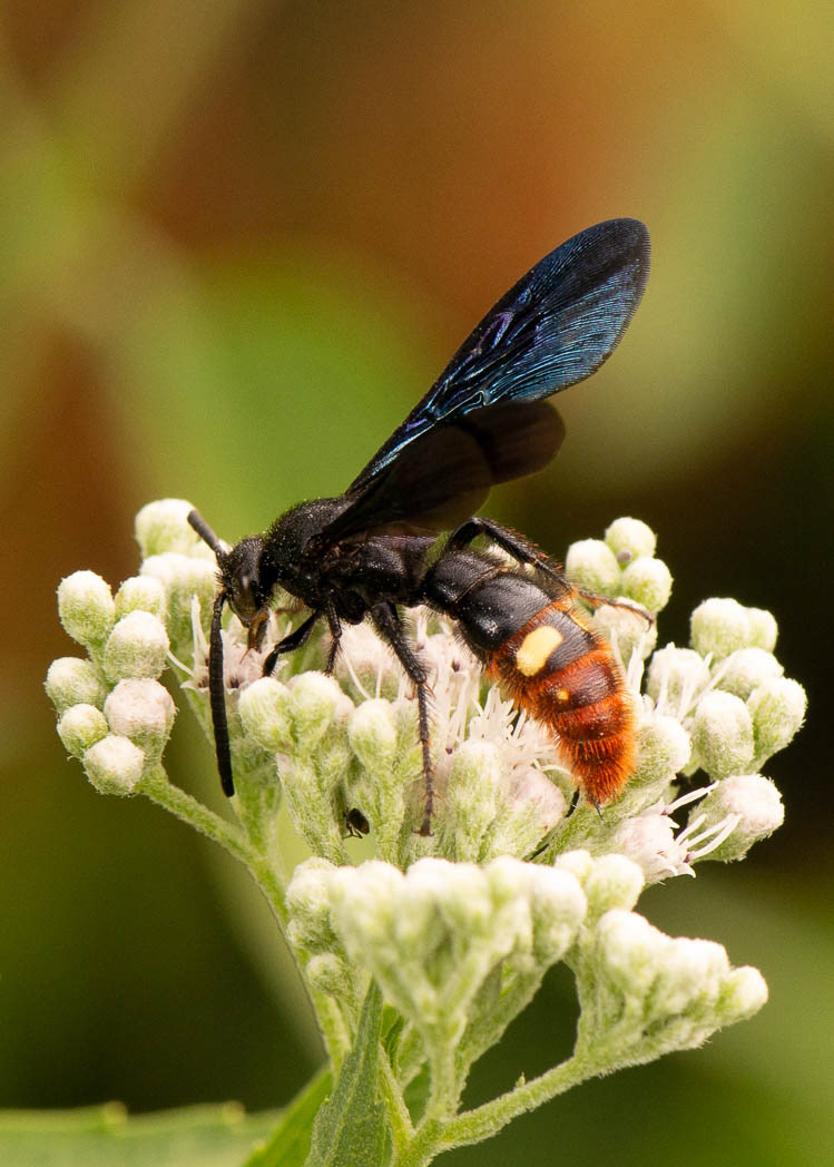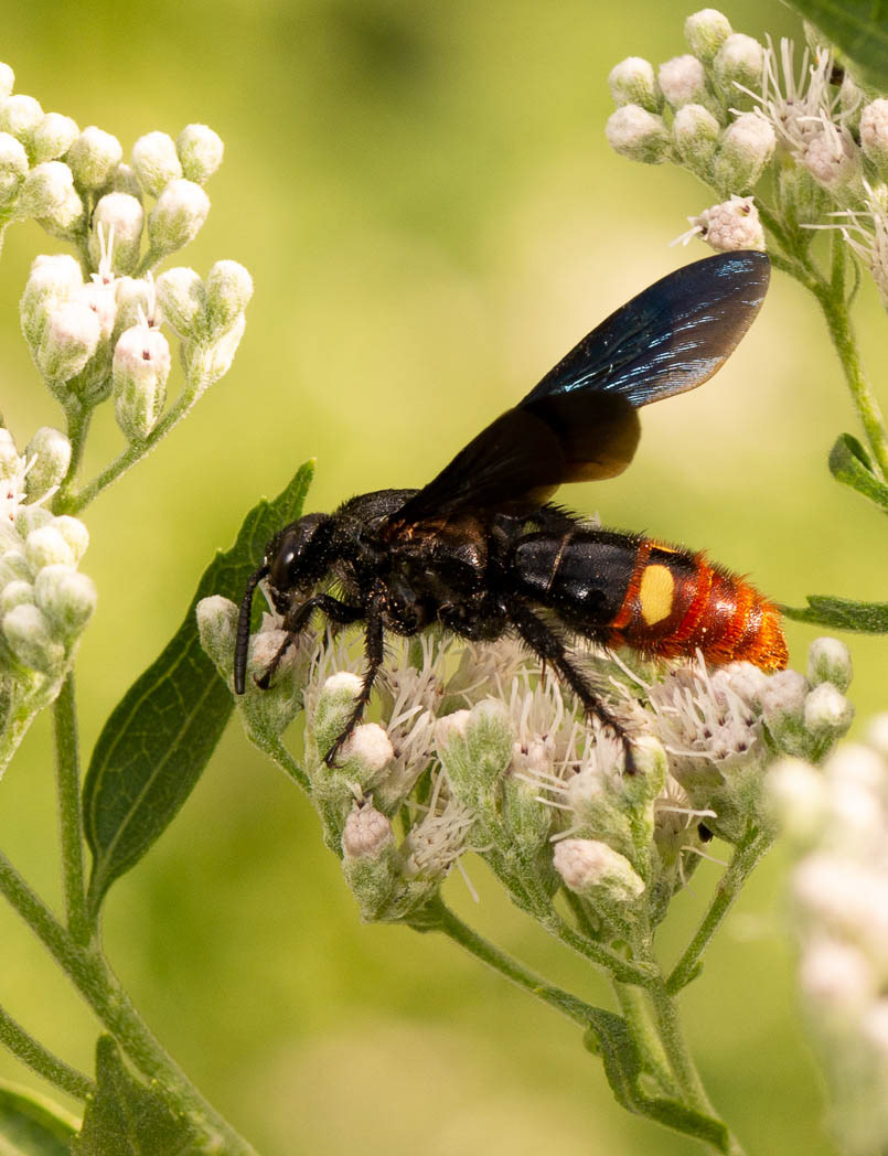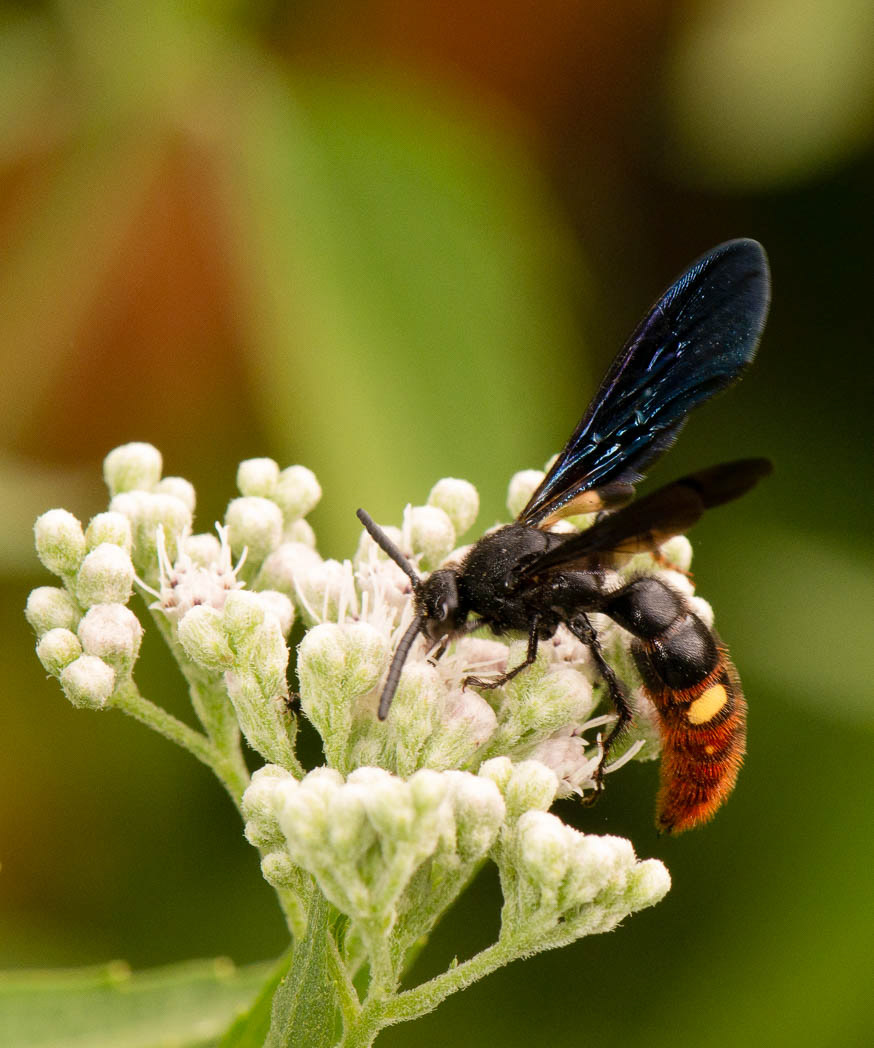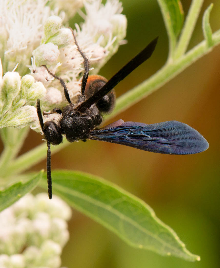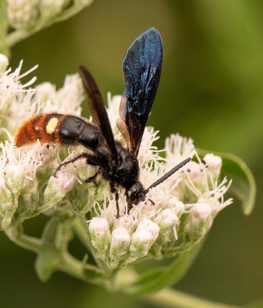 The Blue-Winged Wasp (Scolia dubia) is one of the Scolid wasps, a species that hunts beetles to nourish its larva. There are approximately 20 varieties of Scolid wasps in North America. This one digs in the ground to find grubs of several kinds of beetles including the Scarab, June, and Japanese beetles. The female paralyzes the grub with her stinger and then often digs the same hole deeper and makes a chamber where she places the grub and lays an egg on it. The larva that hatches then feeds on the grub. The adults feed on nectar. A native species, they range widely in the United States. They do not sting people unless molested and are a boon to gardeners.
