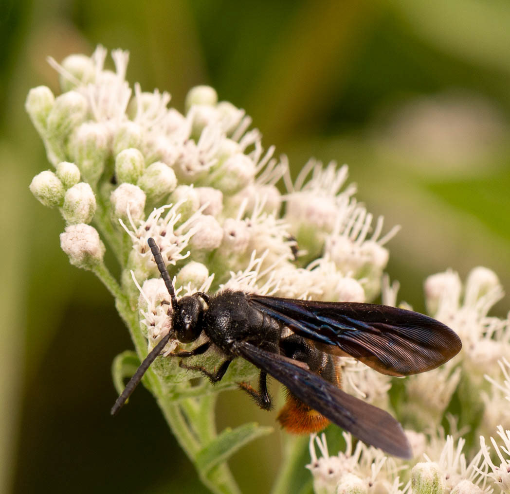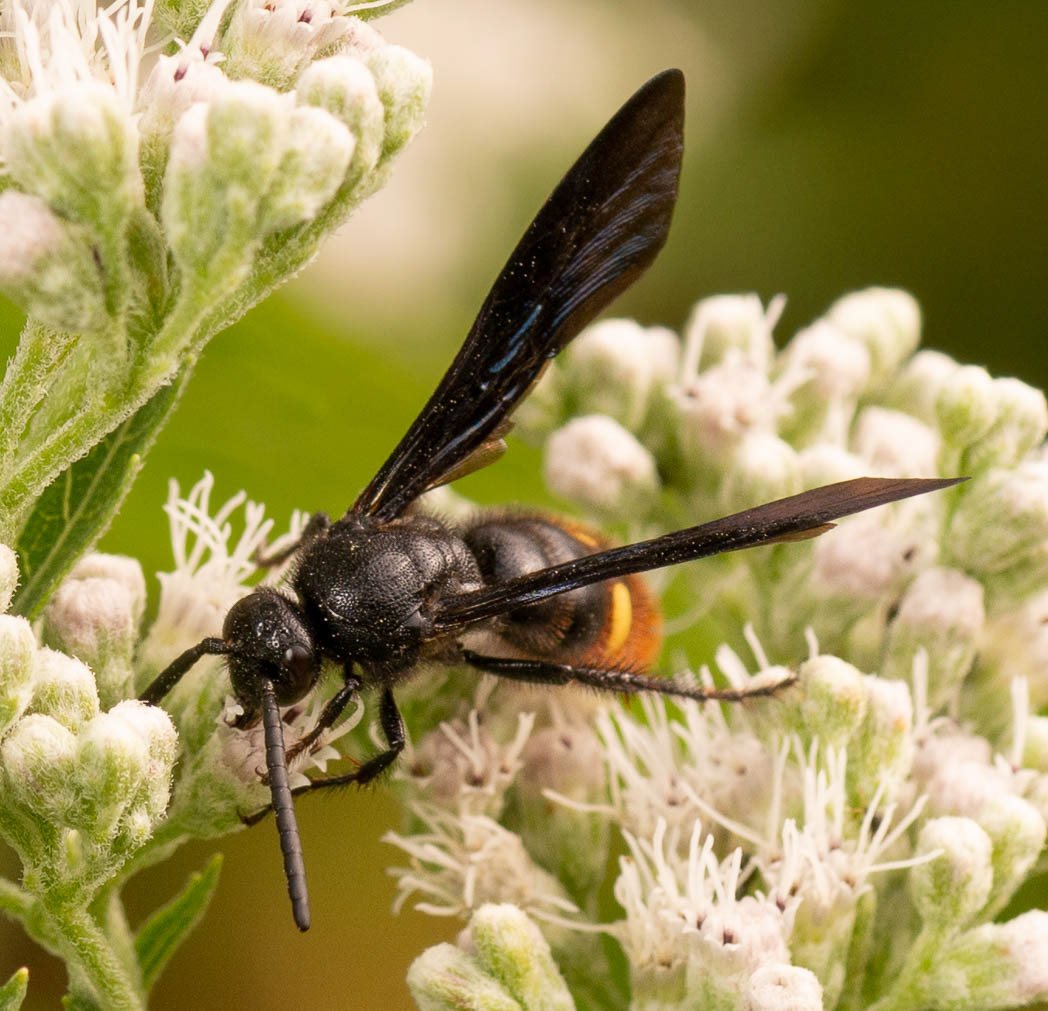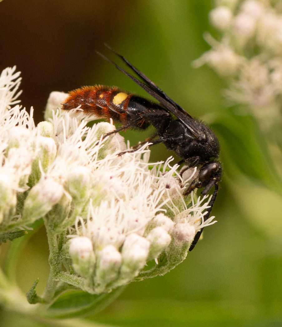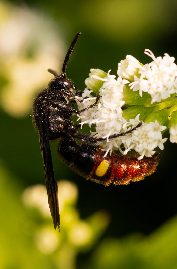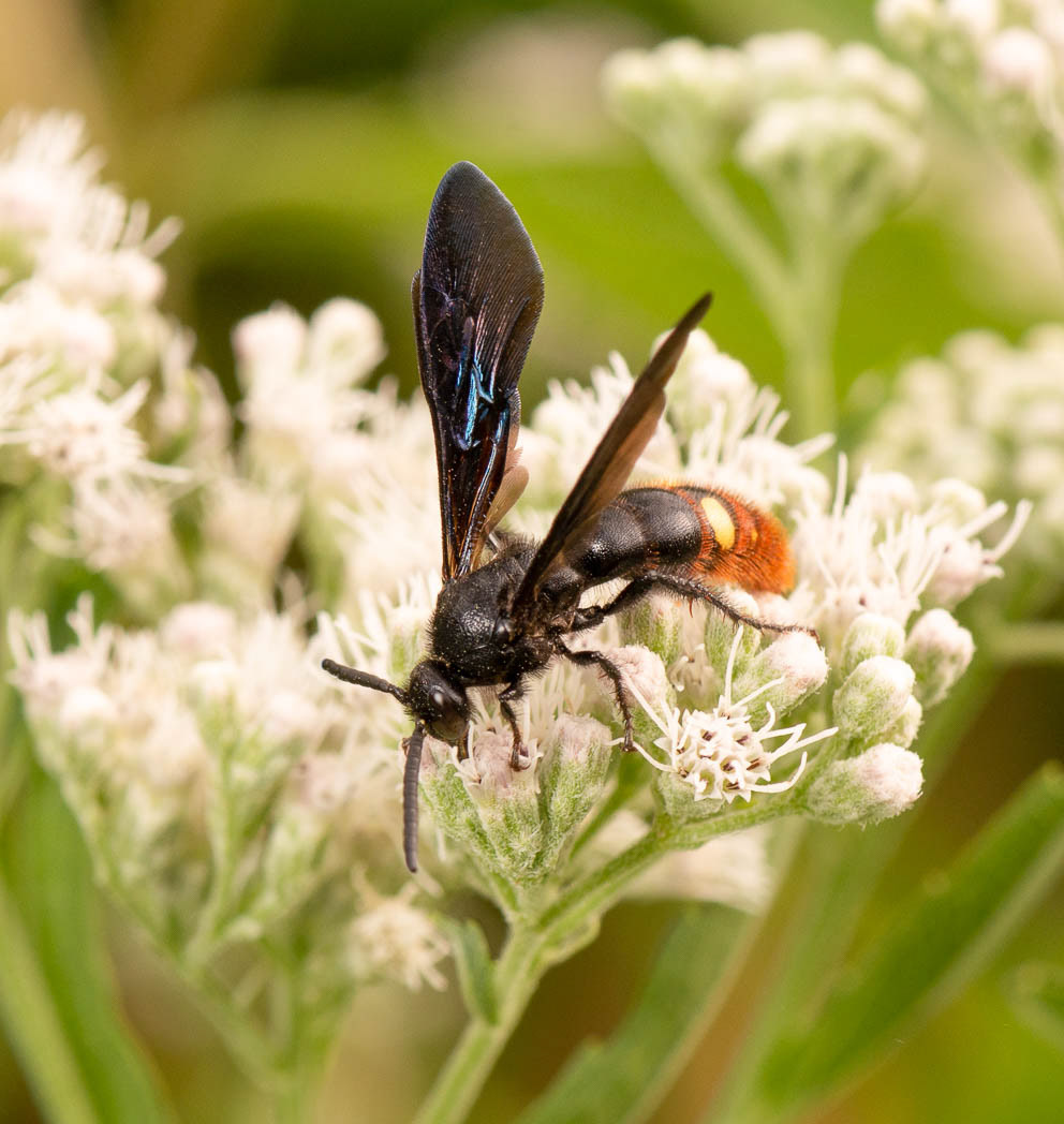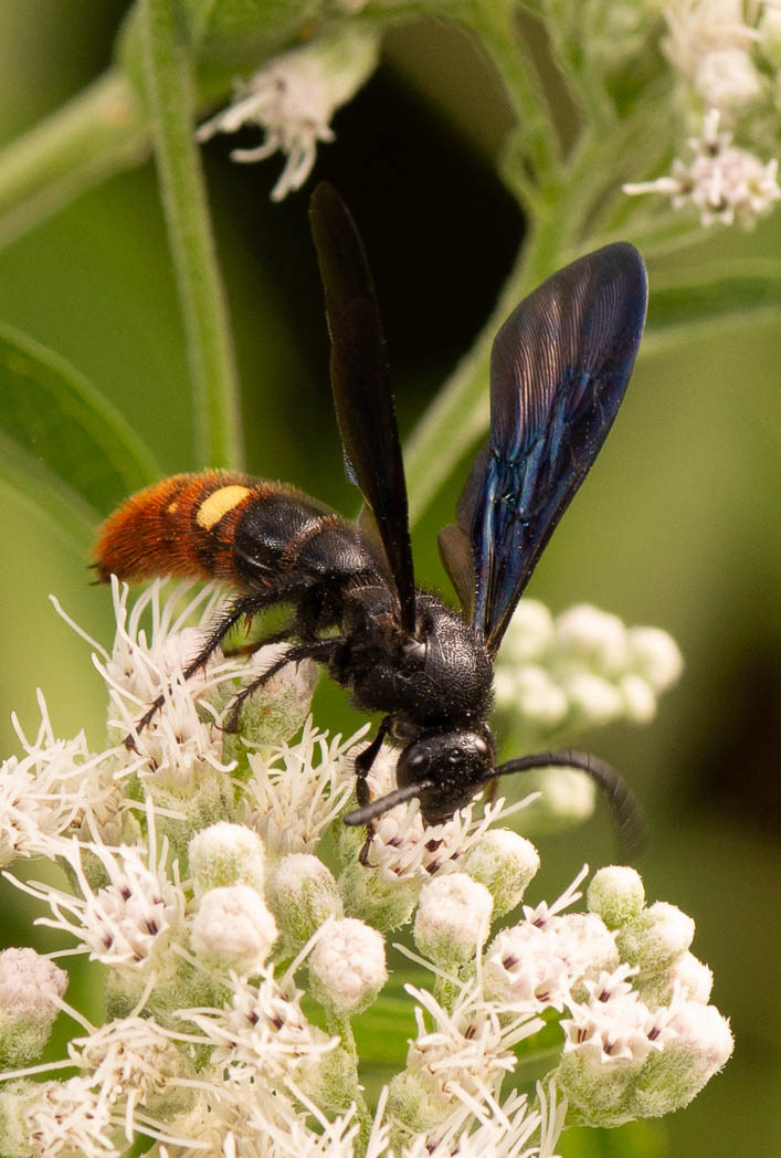 The Blue-Winged Wasp (Scolia dubia) is one of the Scolid wasps, a species that hunts beetles to nourish its larva. There are approximately 20 varieties of Scolid wasps in North America. This one digs in the ground to find grubs of several kinds of beetles including the Scarab, June, and Japanese beetles. The female paralyzes the grub with her stinger and then often digs the same hole deeper and makes a chamber where she places the grub and lays an egg on it. The larva that hatches then feeds on the grub. The adults feed on nectar. A native species, they range widely in the United States. They do not sting people unless molested and are a boon to gardeners.