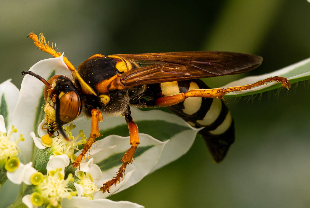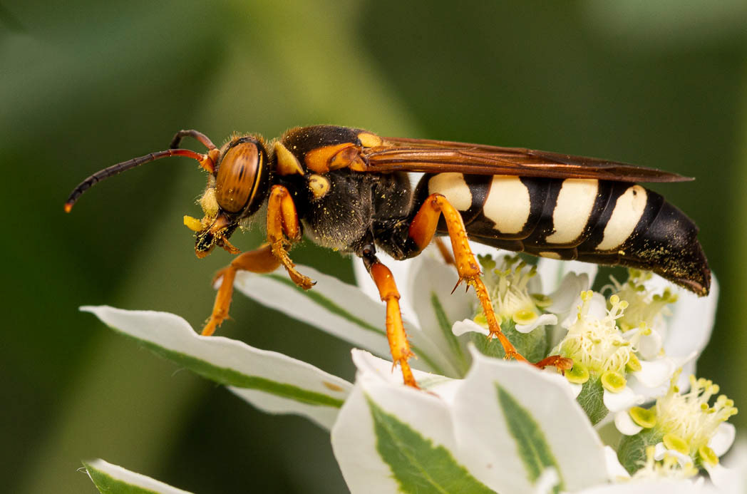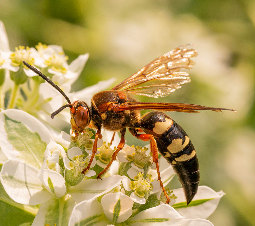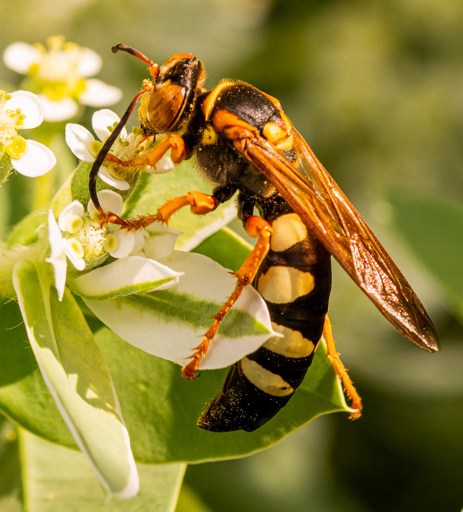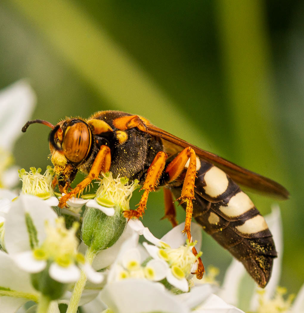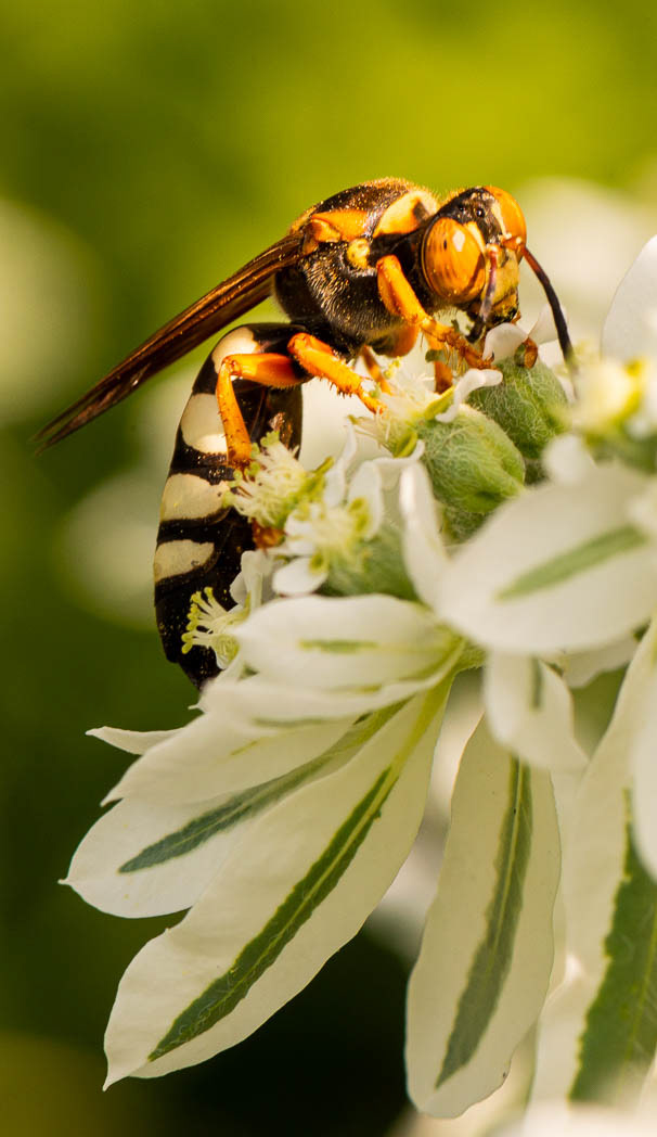 The Eastern Cicada Killer (Sphecius speciosus) males cannot sting though they can jab with their sharp spine. The females' stinger is not for defense but for paralyzing cicadas. The males aggression, scary as it may appear to us, is directed not against people but against other males to protect valuable nesting areas to which they have laid claim. It may at times appear to attack people near its nesting area, but it is actually closely investigating for female Cicada Killers. The females are also not aggressive toward people unless they are treated roughly. The female digs a ten to twenty inch tunnel into which she carves a chamber. She then catches a Cicada, usually in flight, and paralyzes it. The Cicada is over twice as heavy as she is. She holds it upside down as she flies to the tunnel she has dug. She may have to first drag the Cicada up a tree to start her flight high enough. She places one paralyzed Cicada with a male egg and two or three with a female egg because the females are much larger. The larvae eat the Cicadas for around two weeks before making a cocoon for the winter. The female Cicada Killer will make multiple chambers in each tunnel for her eggs. The adults live up to 75 days during the warm months into the early fall. There are four species if Cicada Killer wasps in North America and more worldwide.
