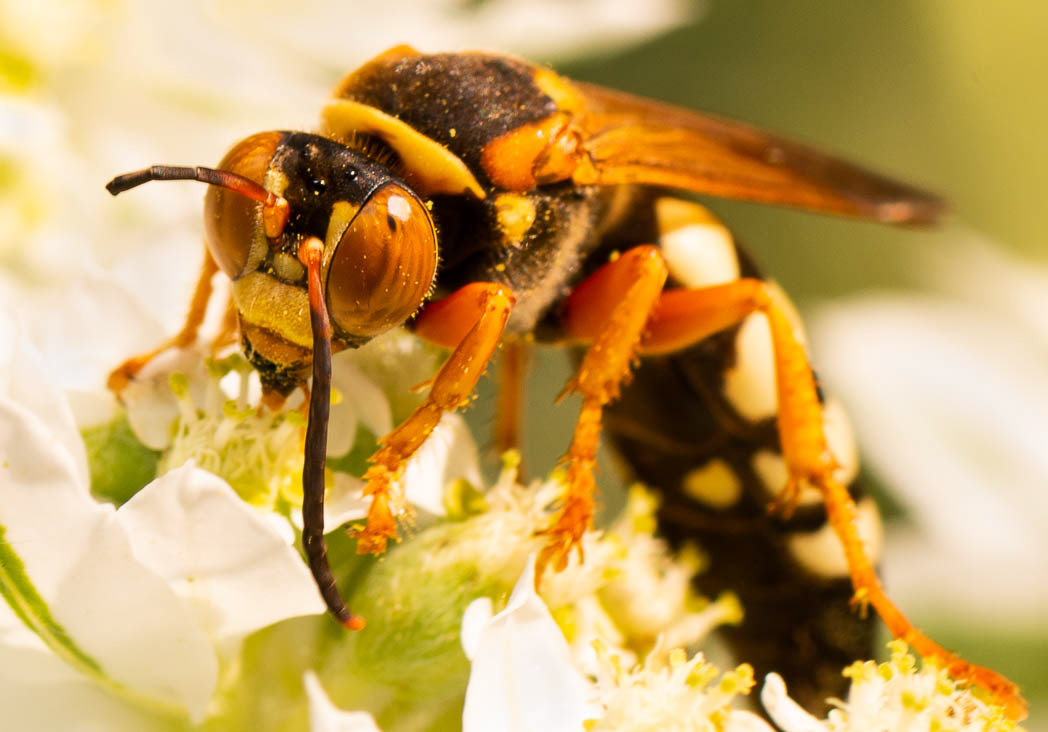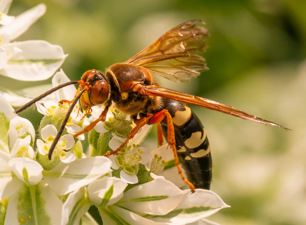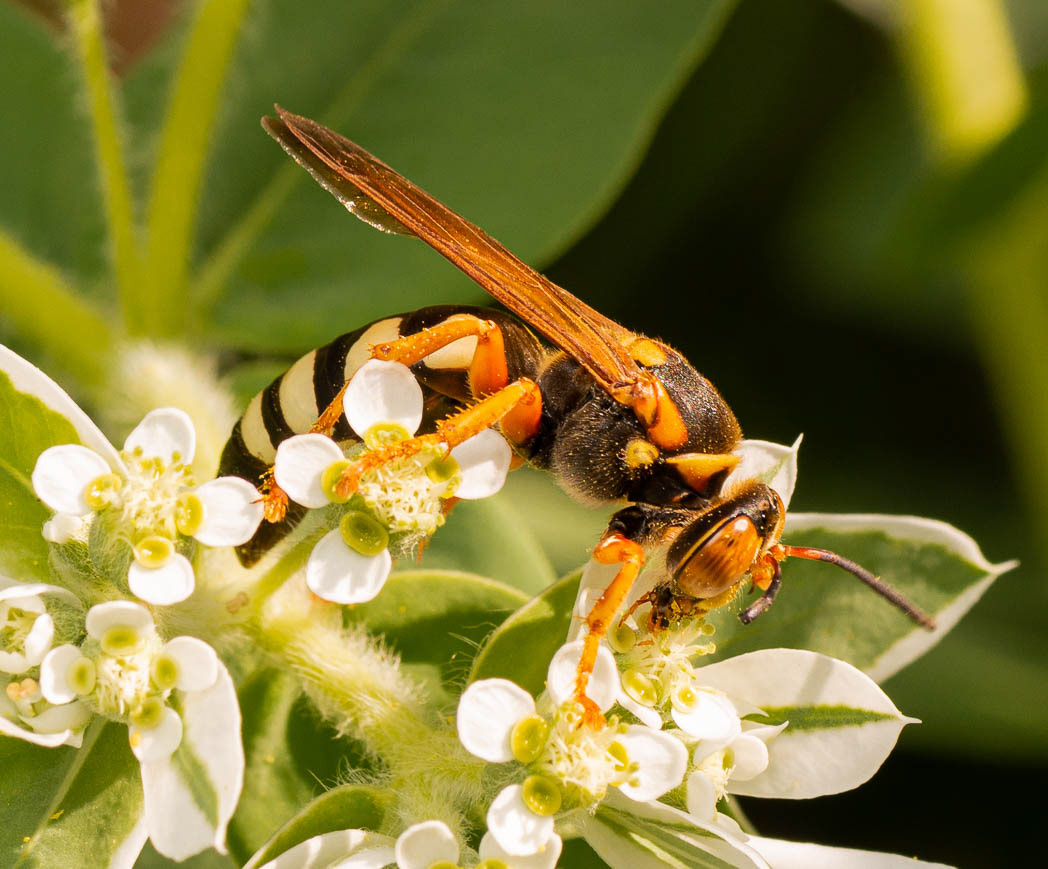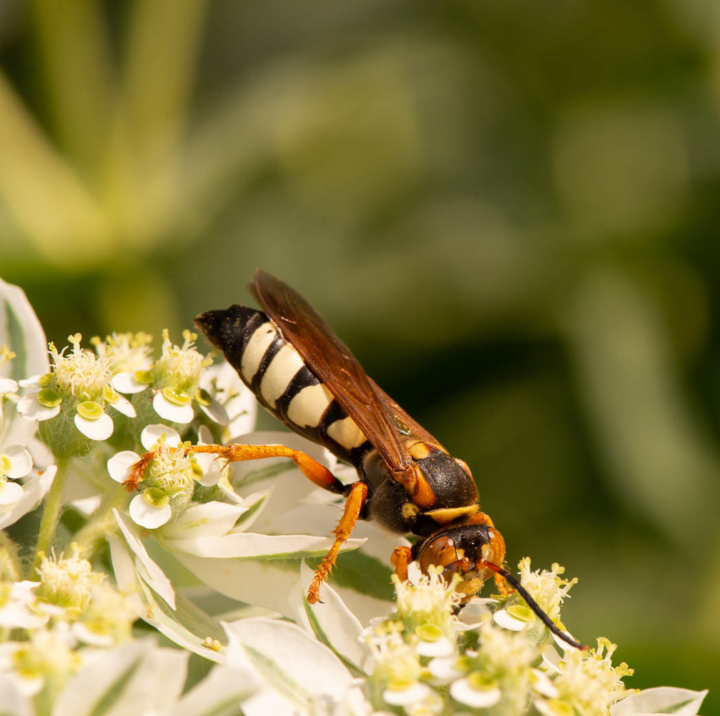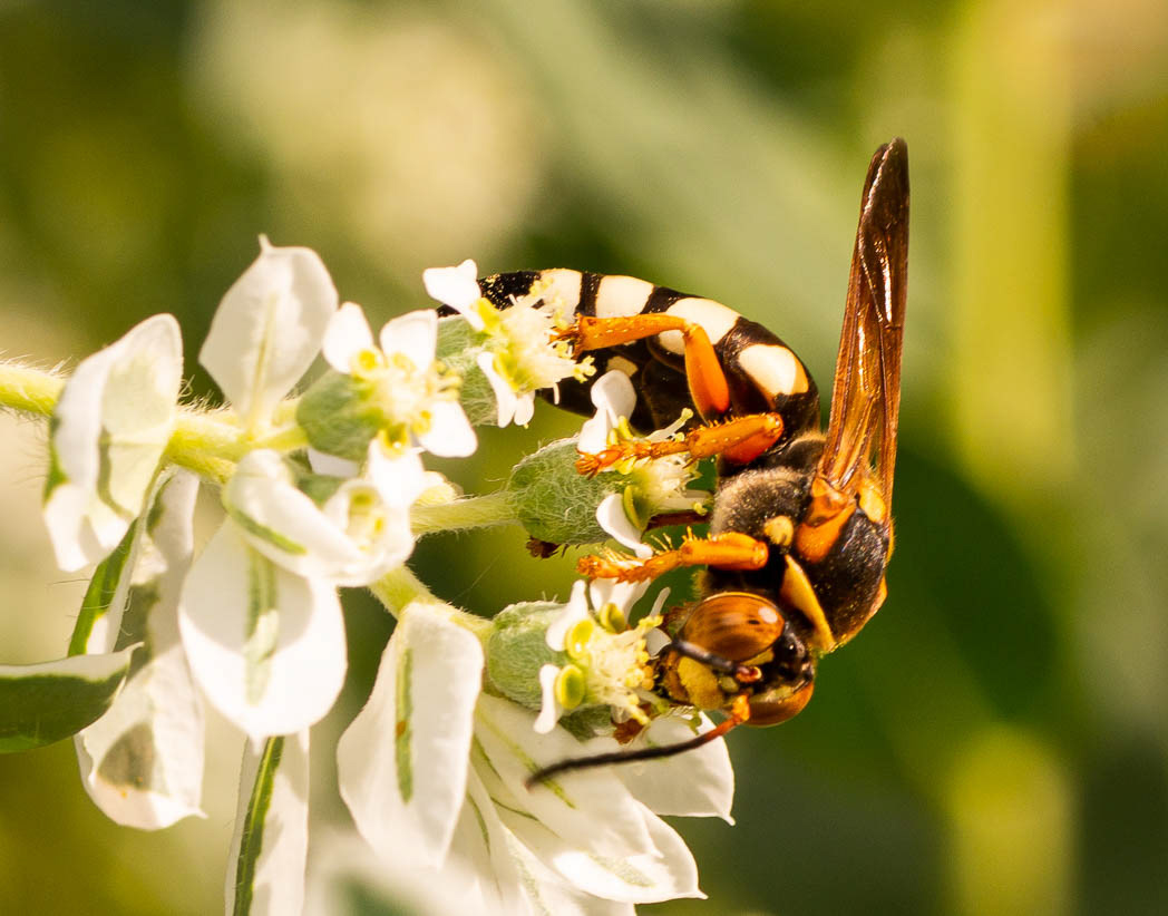 The Eastern Cicada Killer (Sphecius speciosus) males cannot sting though they can jab with their sharp spine. The females' stinger is not for defense but for paralyzing cicadas. The males aggression, scary as it may appear to us, is directed not against people but against other males to protect valuable nesting areas to which they have laid claim. It may at times appear to attack people near its nesting area, but it is actually closely investigating for female Cicada Killers. The females are also not aggressive toward people unless they are treated roughly. The female digs a ten to twenty inch tunnel into which she carves a chamber. She then catches a Cicada, usually in flight, and paralyzes it. The Cicada is over twice as heavy as she is. She holds it upside down as she flies to the tunnel she has dug. She may have to first drag the Cicada up a tree to start her flight high enough. She places one paralyzed Cicada with a male egg and two or three with a female egg because the females are much larger. The larvae eat the Cicadas for around two weeks before making a cocoon for the winter. The female Cicada Killer will make multiple chambers in each tunnel for her eggs. The adults live up to 75 days during the warm months into the early fall. There are four species if Cicada Killer wasps in North America and more worldwide.