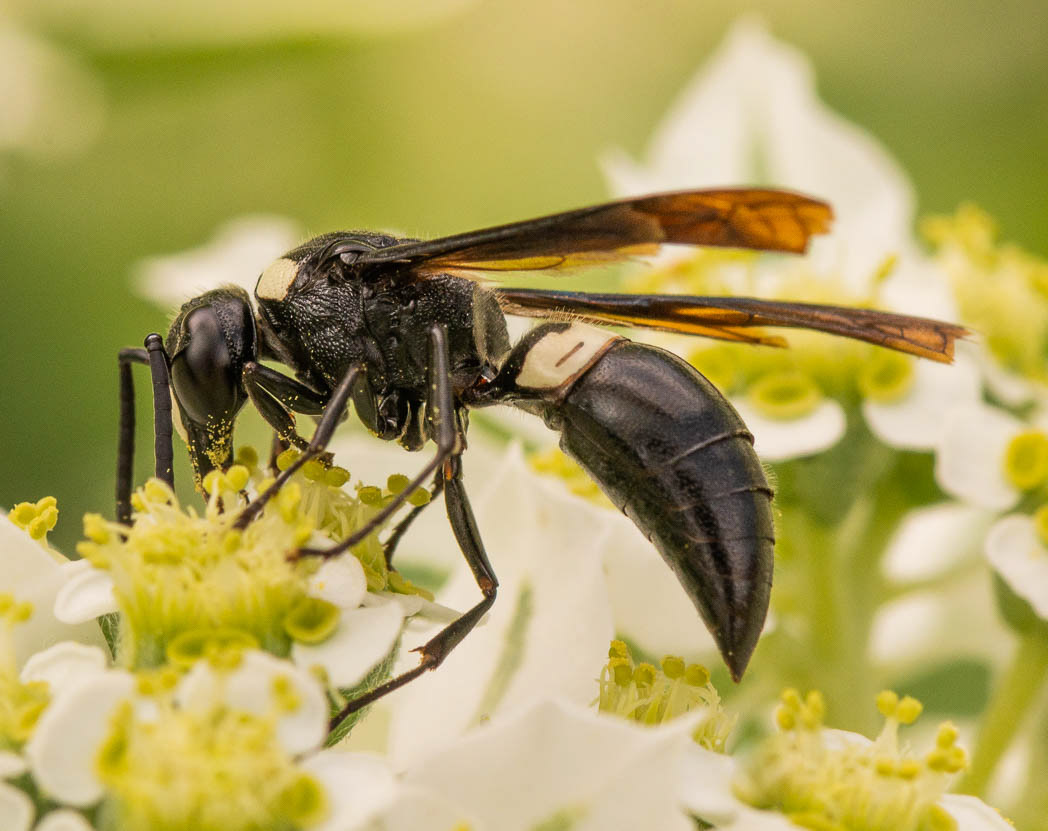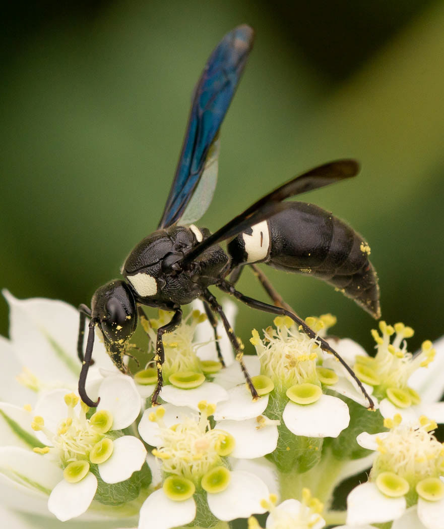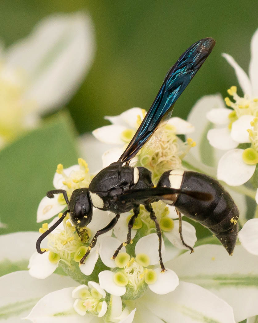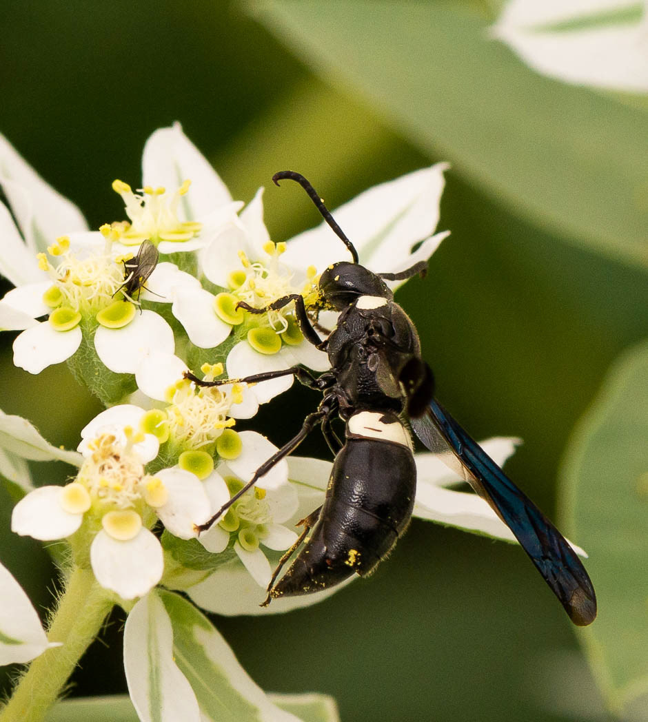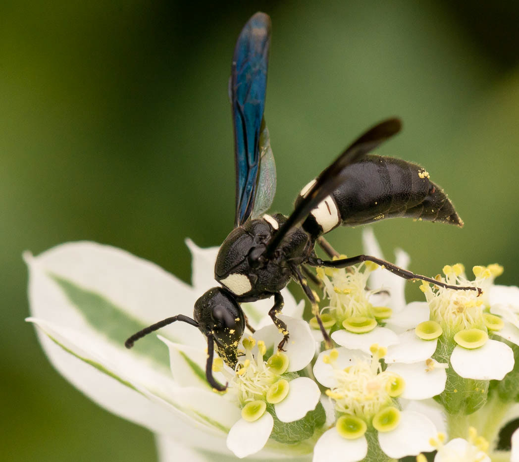 The Four-Toothed Mason Wasp (Monobia Quadridens), a solitary wasp, likes to use unoccupied holes or nesting chambers made by various other insects, or she will make her own tunnel in dirt or wood. She has also been observed evicting residents of an occupied chamber. The female fills the chamber with one of her eggs and multiple (sometimes approaching 20) caterpillars that she has paralyzed to sustain the larva. She can decide whether to lay a male or a female egg, and she lays the male egg closer to the entrance because it matures sooner. She seals the entrance with mud, leaves an air space, and seals it again. Naturalists are not sure why, but it might be to provide insulation or to fool would be parasites. Wintering is hard on the larvae because they do not make a cocoon. The female lays about 20 eggs, and there are two generations per year at least in their southern range. While the female can sting, the male can only stab, but this wasp is not aggressive and seldom stings people. However, at first glance it does look a lot like the Bald-Faced Hornet, which is a colony (social) wasp that can be aggressive. The Four-Toothed Mason Wasp has a white band at the upper end of the abdomen, while the Bald-Faced Hornet has white bands near the stinger. These wasps are beneficial to gardeners for the caterpillars they consume and as pollinators because the adults eat nectar and pollen.