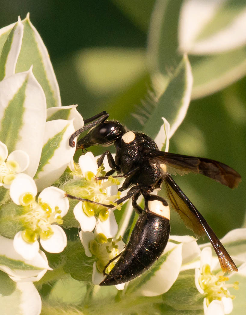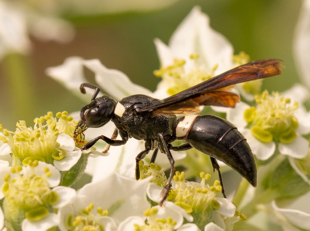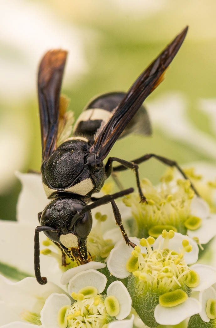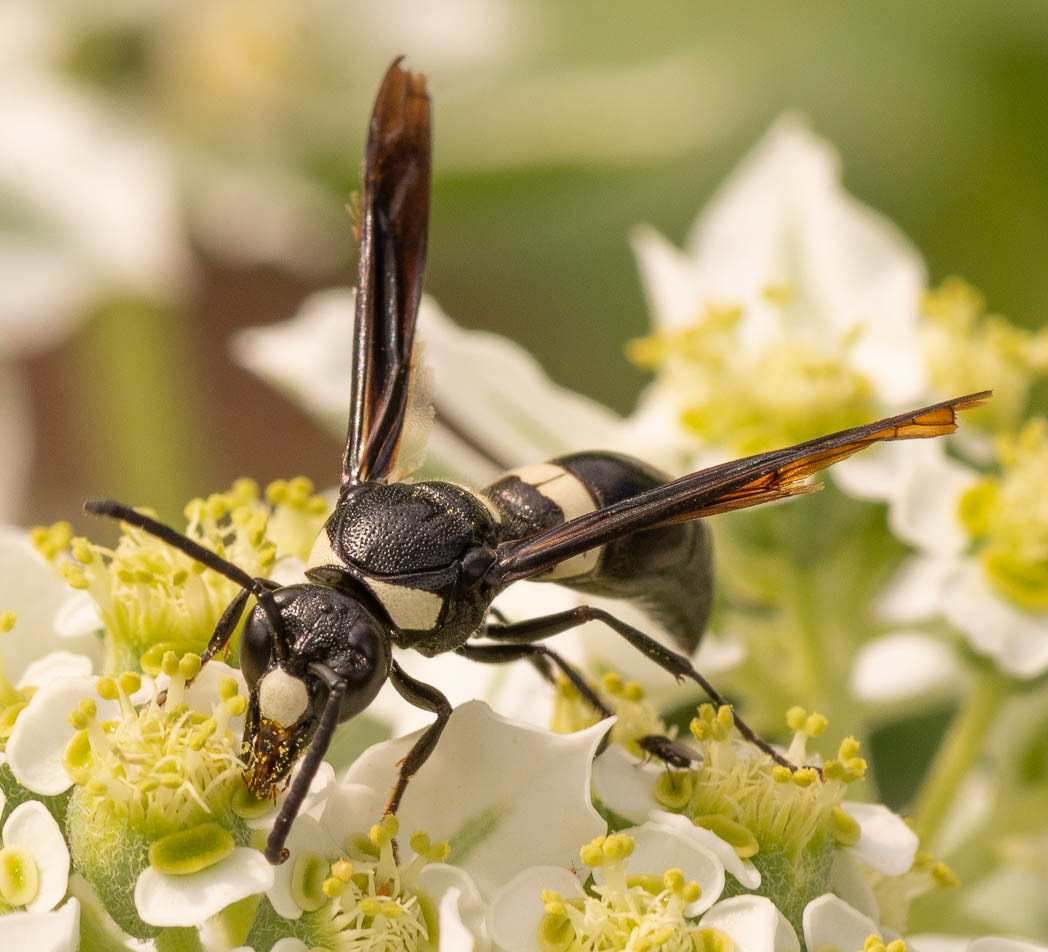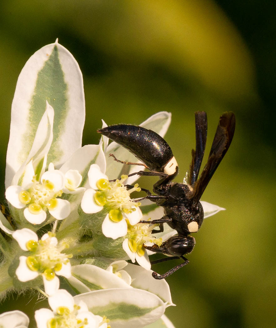 The Four-Toothed Mason Wasp (Monobia Quadridens), a solitary wasp, likes to use unoccupied holes or nesting chambers made by various other insects, or she will make her own tunnel in dirt or wood. She has also been observed evicting residents of an occupied chamber. The female fills the chamber with one of her eggs and multiple (sometimes approaching 20) caterpillars that she has paralyzed to sustain the larva. She can decide whether to lay a male or a female egg, and she lays the male egg closer to the entrance because it matures sooner. She seals the entrance with mud, leaves an air space, and seals it again. Naturalists are not sure why, but it might be to provide insulation or to fool would be parasites. Wintering is hard on the larvae because they do not make a cocoon. The female lays about 20 eggs, and there are two generations per year at least in their southern range. While the female can sting, the male can only stab, but this wasp is not aggressive and seldom stings people. However, at first glance it does look a lot like the Bald-Faced Hornet, which is a colony (social) wasp that can be aggressive. The Four-Toothed Mason Wasp has a white band at the upper end of the abdomen, while the Bald-Faced Hornet has white bands near the stinger. These wasps are beneficial to gardeners for the caterpillars they consume and as pollinators because the adults eat nectar and pollen.