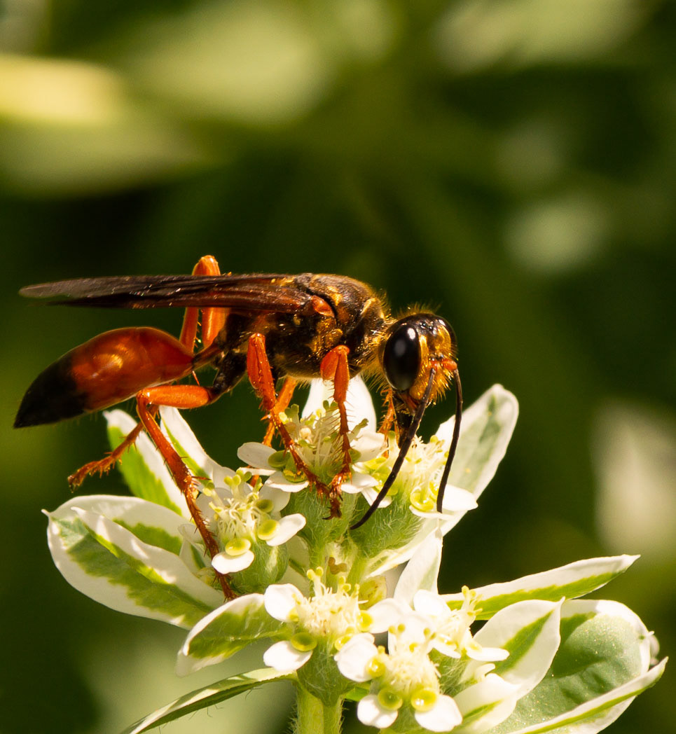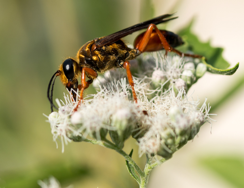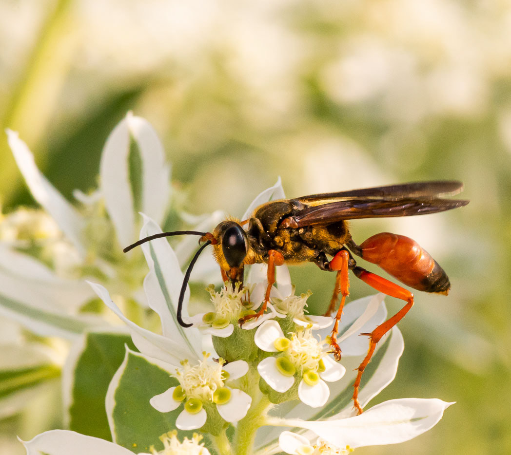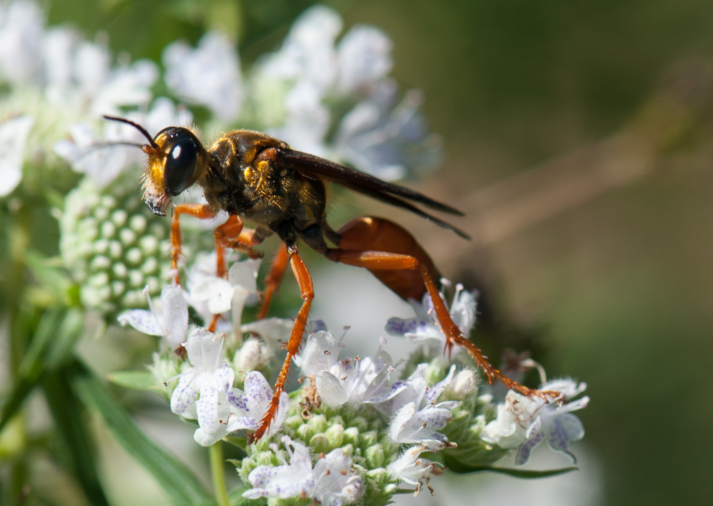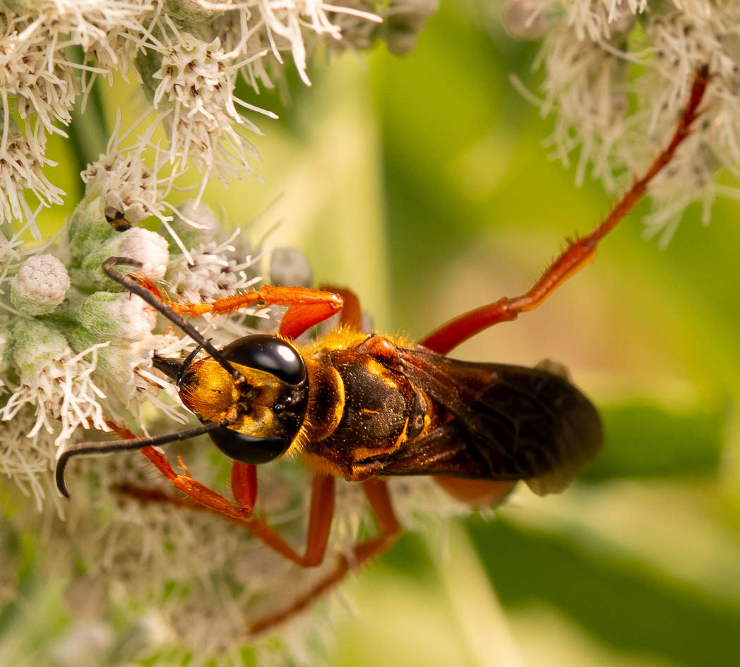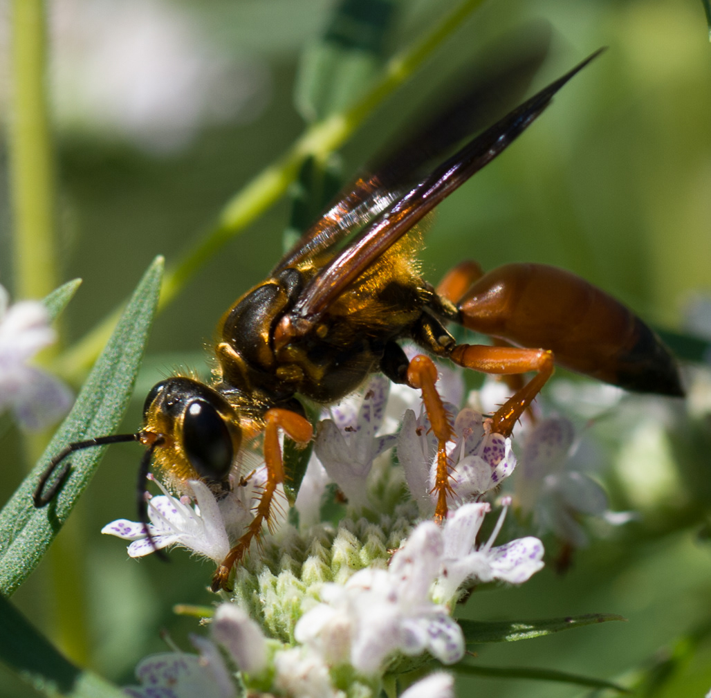 The Great Golden Digger Wasp (Sphex ichneumoneus) gets great press: "Scary Good," "benign, gentle wasp currently being studied by scientists for its behavioral responses," "The Hardest Working Bug in the Garden". This wasp gets good press for good reasons. Their tunnels help aerate the soil. The adults are pollinators as they live on the nectar of flowers. They capture insects that are garden pests. They are harmless to people unless stepped on or grabbed. The male doesn't even have a stinger. The female uses hers to paralyze prey, such as grasshoppers, katydids, and crickets, upon which to lay an egg after dragging it into one of two or three chambers connected horizontally to a four to six inch deep vertical tunnel. She digs several of these tunnels. She can't seem to keep track of how many insects she needs if she is robbed by a bird on her way back to her tunnel. She leaves her prey at the mouth of the tunnel, goes inside to inspect the tunnel to make sure all is well, and then returns to drag the prey into the tunnel. If the prey is moved a few inches while she is inspecting, when she returns she will put it back at the mouth of the tunnel and repeat her tunnel inspection. She will do this repetitively indicating that this behavior is genetically programmed. At more than an inch, they are one of the largest of the solitary thread-waisted digger wasps. The adult lives 1-2 months in the summer during which the females dig and provision their tunnels. Not realizing that these are beneficial creatures, many homeowners exterminate them.