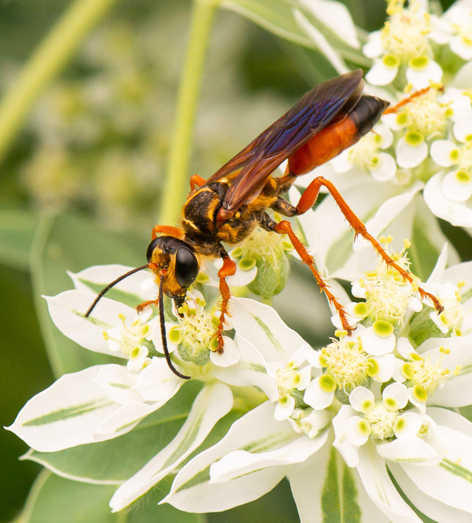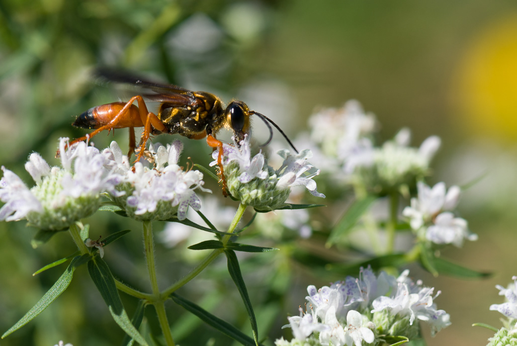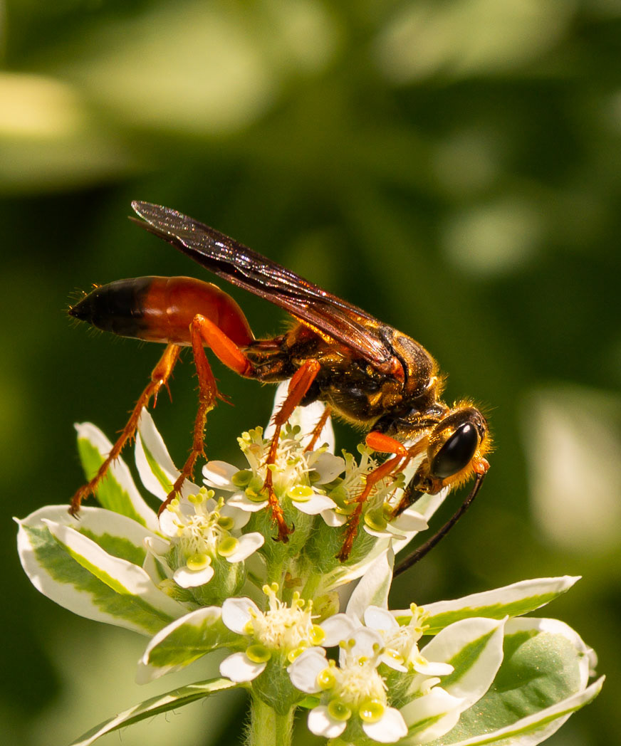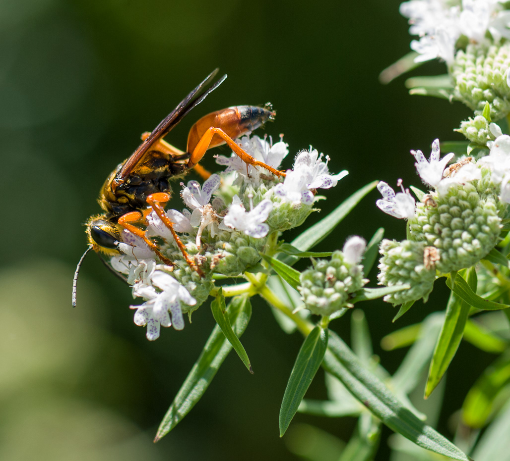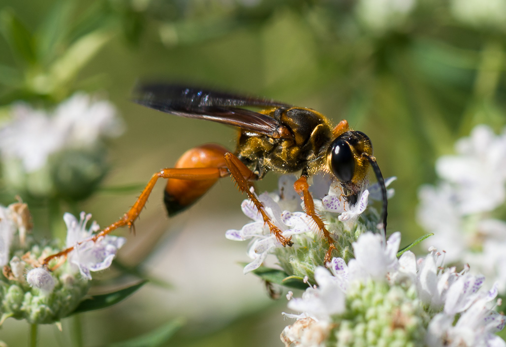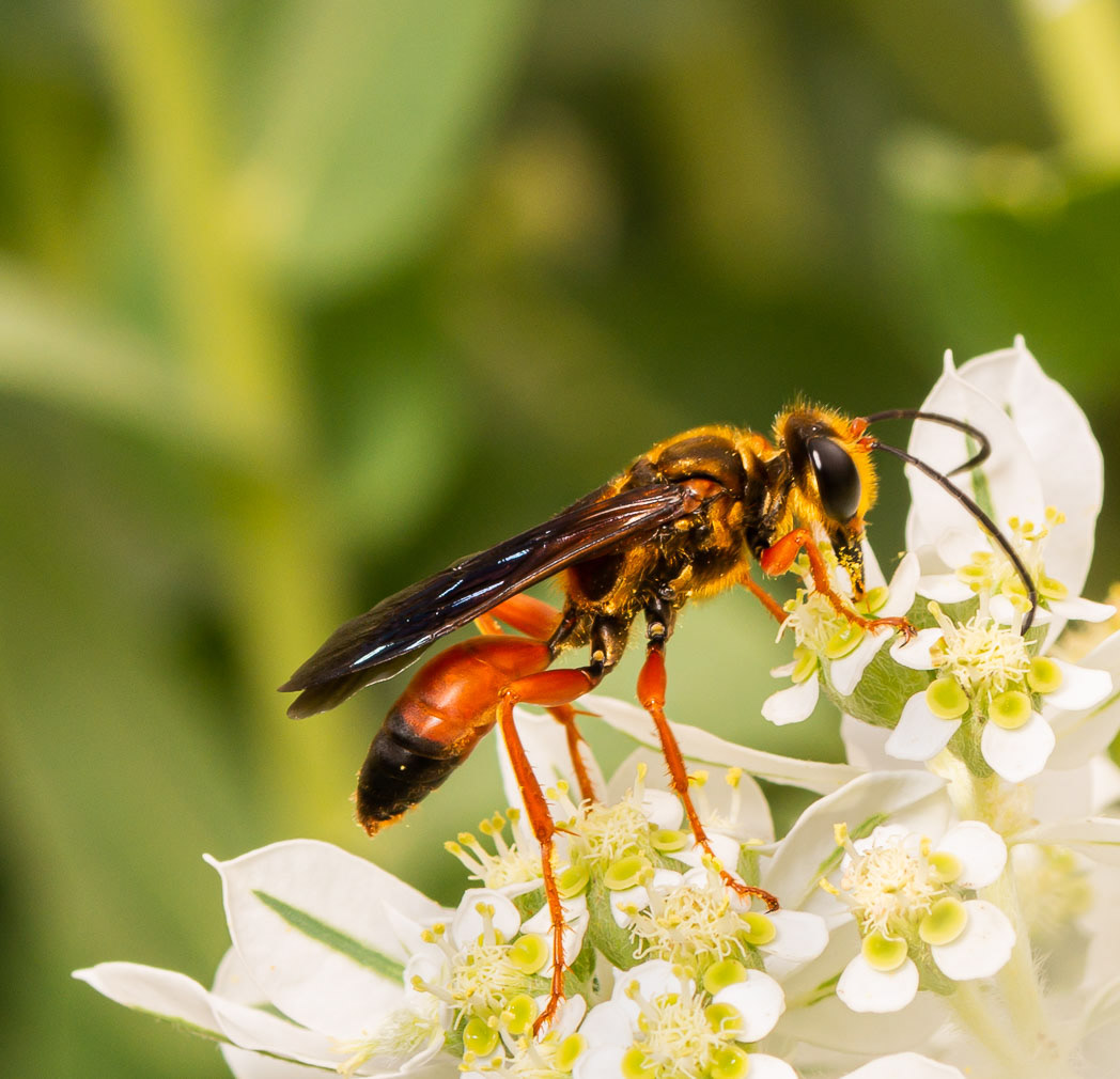 The Great Golden Digger Wasp (Sphex ichneumoneus) gets great press: "Scary Good," "benign, gentle wasp currently being studied by scientists for its behavioral responses," "The Hardest Working Bug in the Garden". This wasp gets good press for good reasons. Their tunnels help aerate the soil. The adults are pollinators as they live on the nectar of flowers. They capture insects that are garden pests. They are harmless to people unless stepped on or grabbed. The male doesn't even have a stinger. The female uses hers to paralyze prey, such as grasshoppers, katydids, and crickets, upon which to lay an egg after dragging it into one of two or three chambers connected horizontally to a four to six inch deep vertical tunnel. She digs several of these tunnels. She can't seem to keep track of how many insects she needs if she is robbed by a bird on her way back to her tunnel. She leaves her prey at the mouth of the tunnel, goes inside to inspect the tunnel to make sure all is well, and then returns to drag the prey into the tunnel. If the prey is moved a few inches while she is inspecting, when she returns she will put it back at the mouth of the tunnel and repeat her tunnel inspection. She will do this repetitively indicating that this behavior is genetically programmed. At more than an inch, they are one of the largest of the solitary thread-waisted digger wasps. The adult lives 1-2 months in the summer during which the females dig and provision their tunnels. Not realizing that these are beneficial creatures, many homeowners exterminate them.