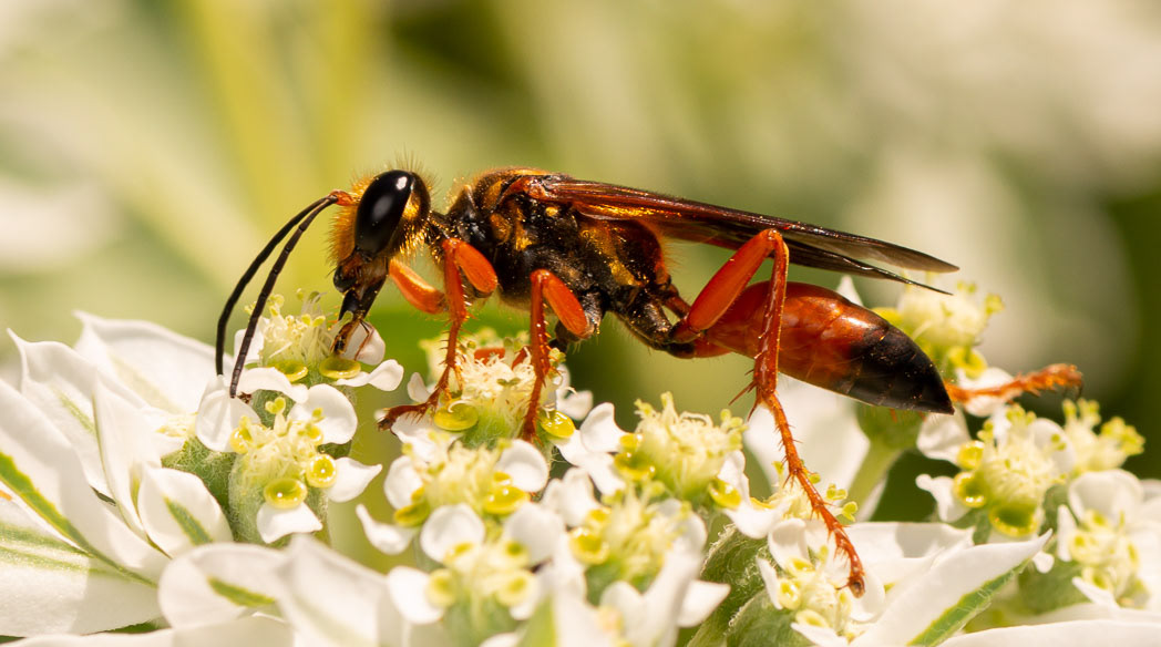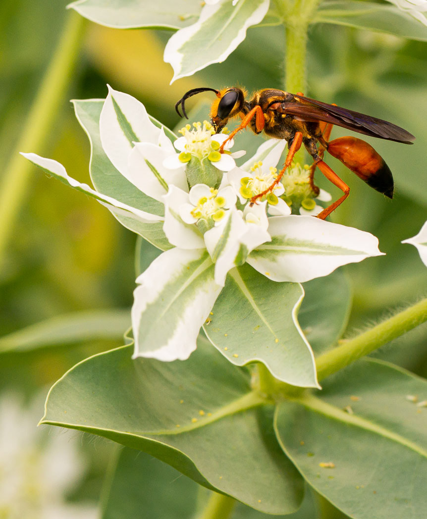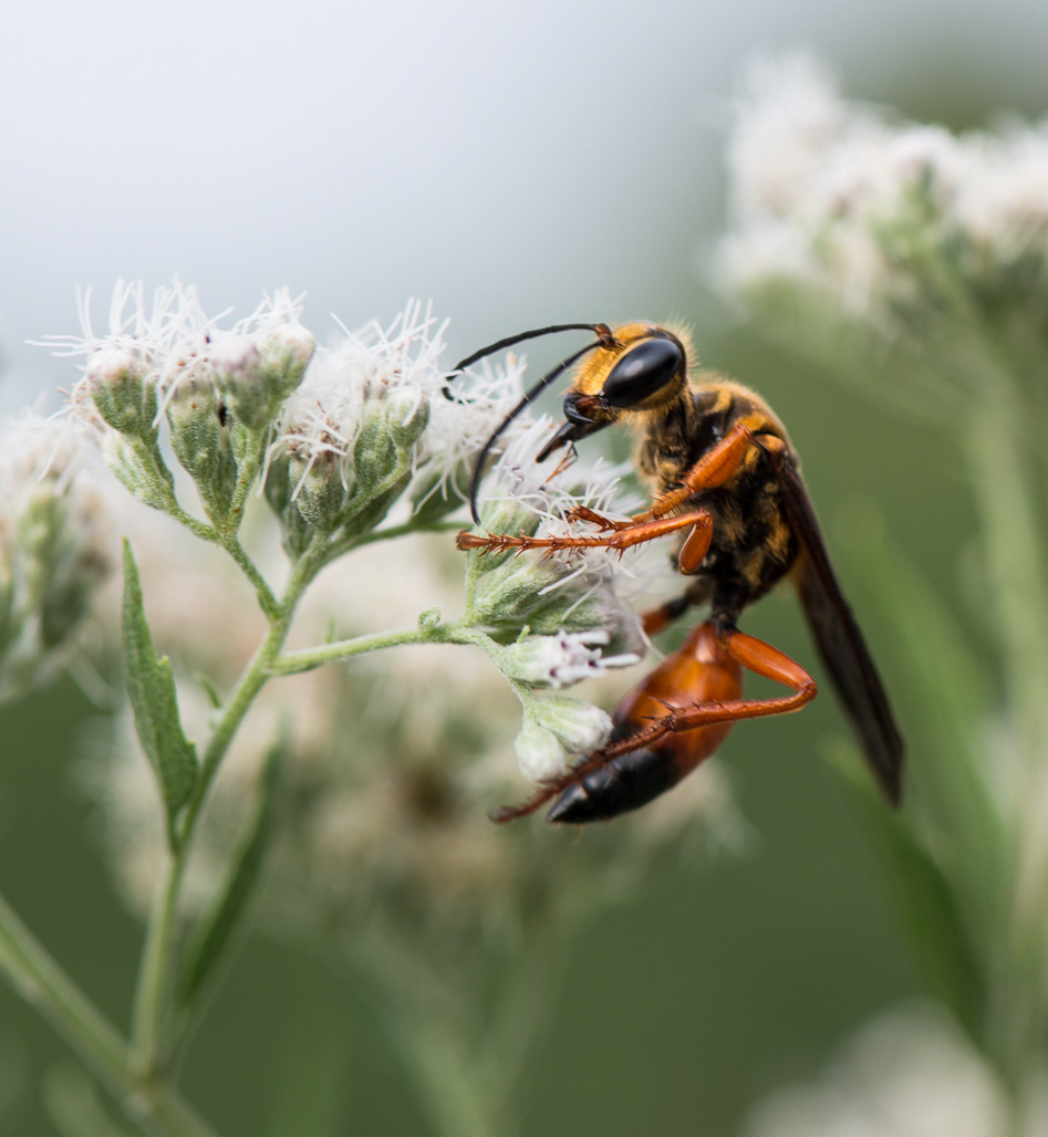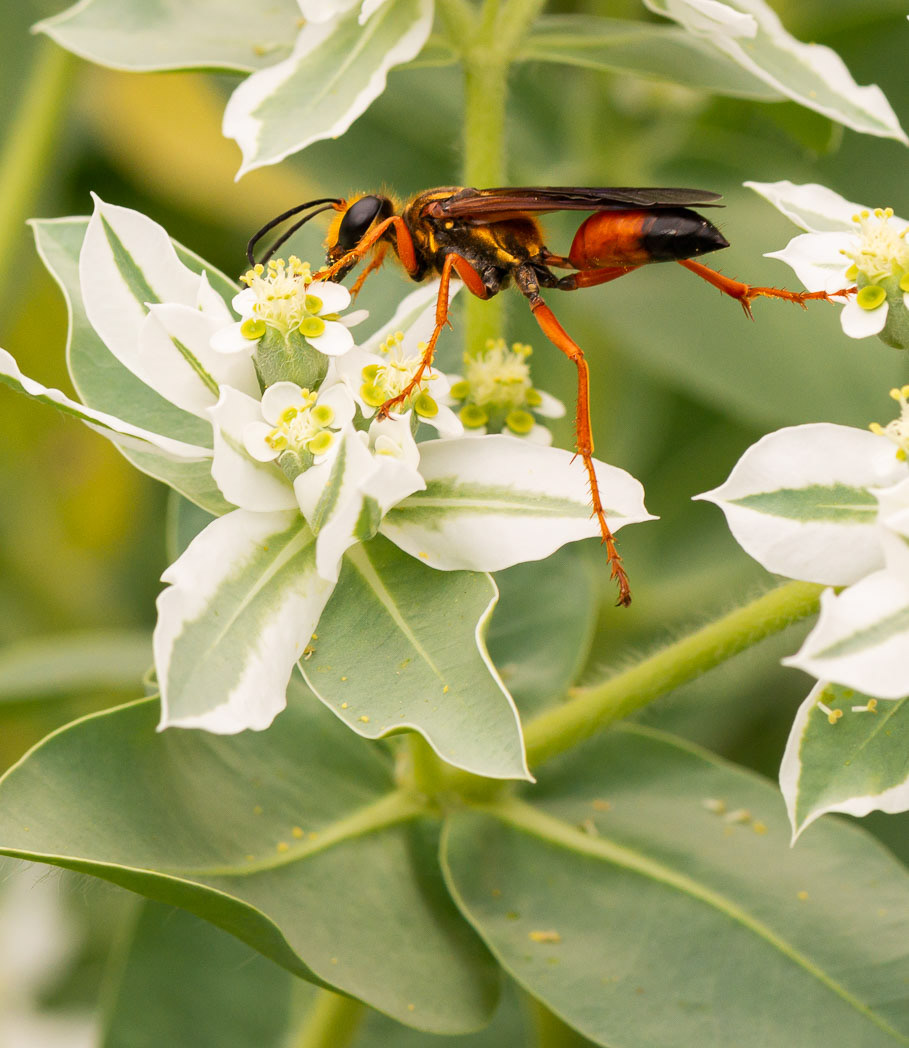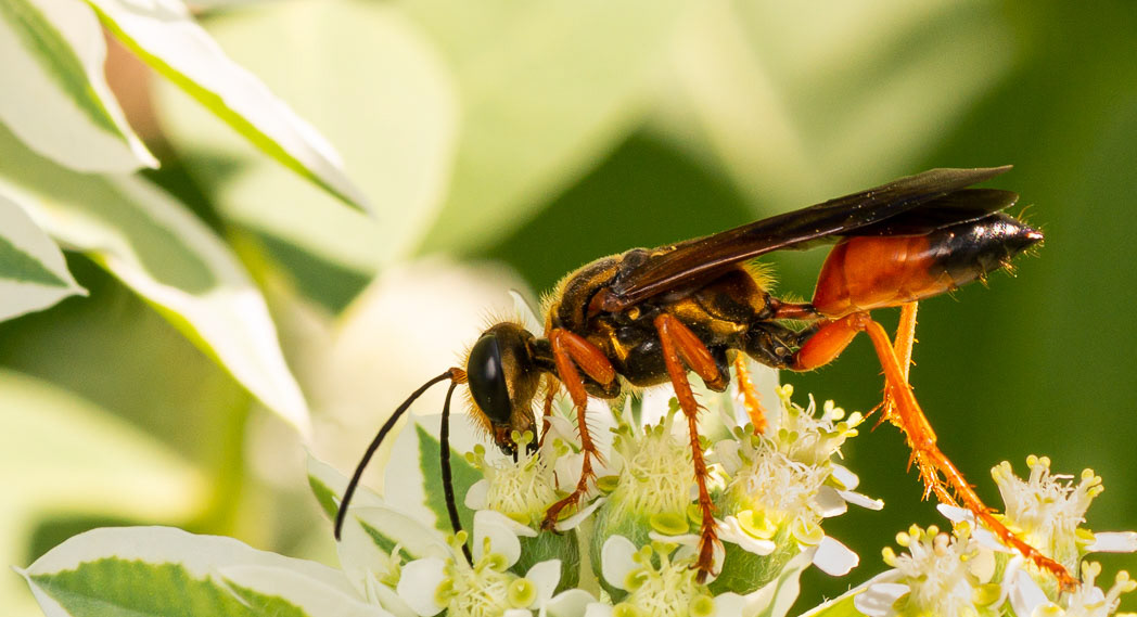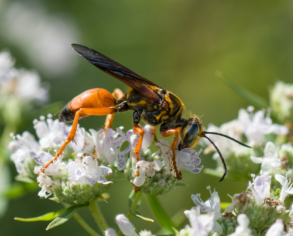 The Great Golden Digger Wasp (Sphex ichneumoneus) gets great press: "Scary Good," "benign, gentle wasp currently being studied by scientists for its behavioral responses," "The Hardest Working Bug in the Garden". This wasp gets good press for good reasons. Their tunnels help aerate the soil. The adults are pollinators as they live on the nectar of flowers. They capture insects that are garden pests. They are harmless to people unless stepped on or grabbed. The male doesn't even have a stinger. The female uses hers to paralyze prey, such as grasshoppers, katydids, and crickets, upon which to lay an egg after dragging it into one of two or three chambers connected horizontally to a four to six inch deep vertical tunnel. She digs several of these tunnels. She can't seem to keep track of how many insects she needs if she is robbed by a bird on her way back to her tunnel. She leaves her prey at the mouth of the tunnel, goes inside to inspect the tunnel to make sure all is well, and then returns to drag the prey into the tunnel. If the prey is moved a few inches while she is inspecting, when she returns she will put it back at the mouth of the tunnel and repeat her tunnel inspection. She will do this repetitively indicating that this behavior is genetically programmed. At more than an inch, they are one of the largest of the solitary thread-waisted digger wasps. The adult lives 1-2 months in the summer during which the females dig and provision their tunnels. Not realizing that these are beneficial creatures, many homeowners exterminate them.
