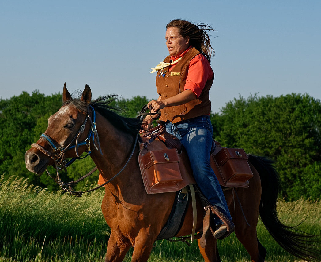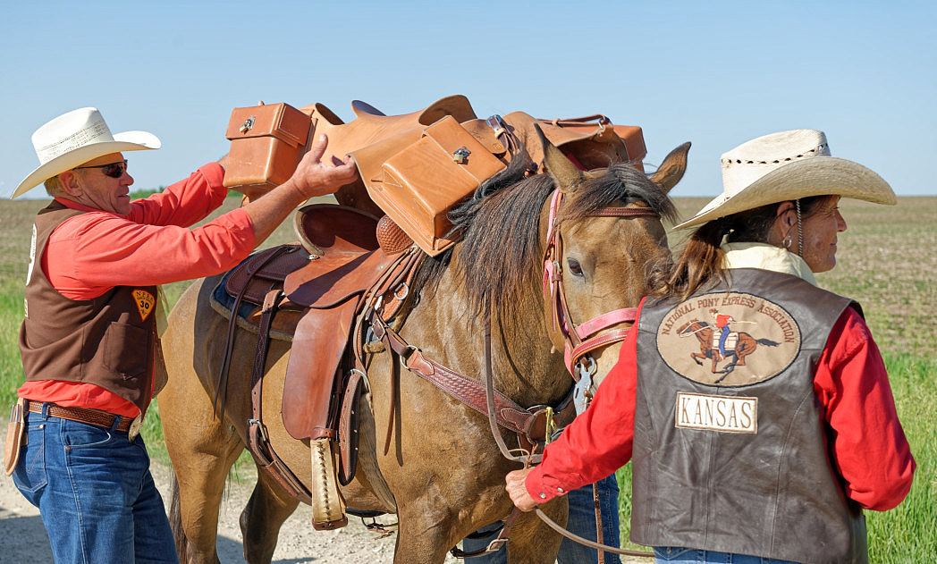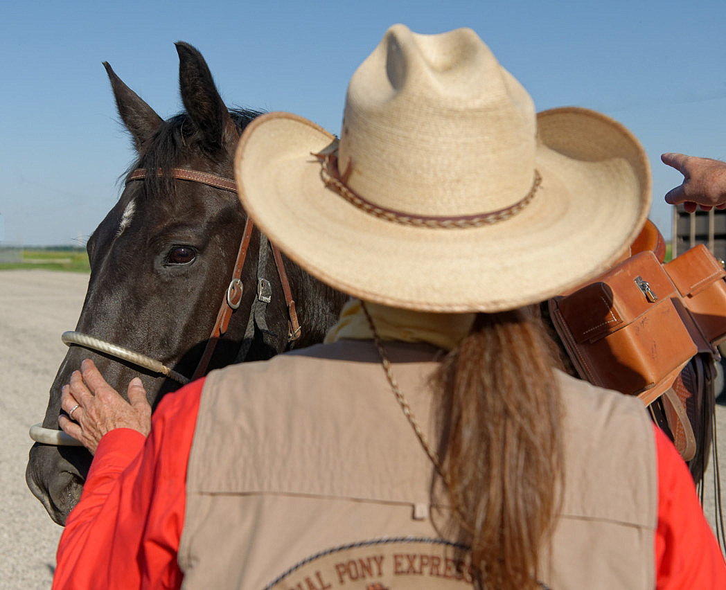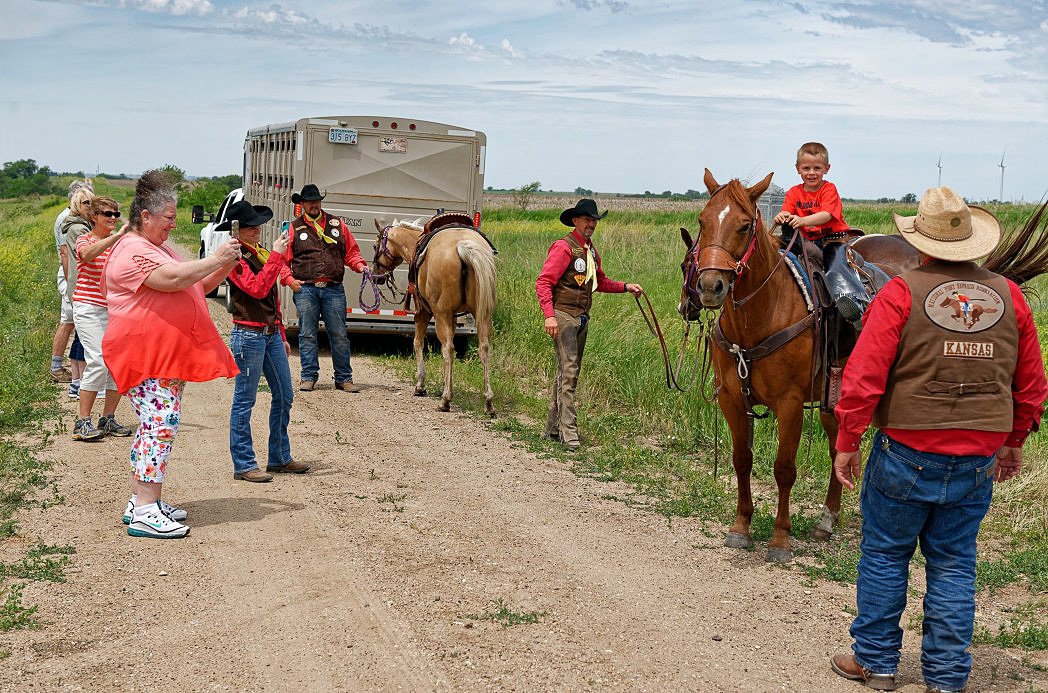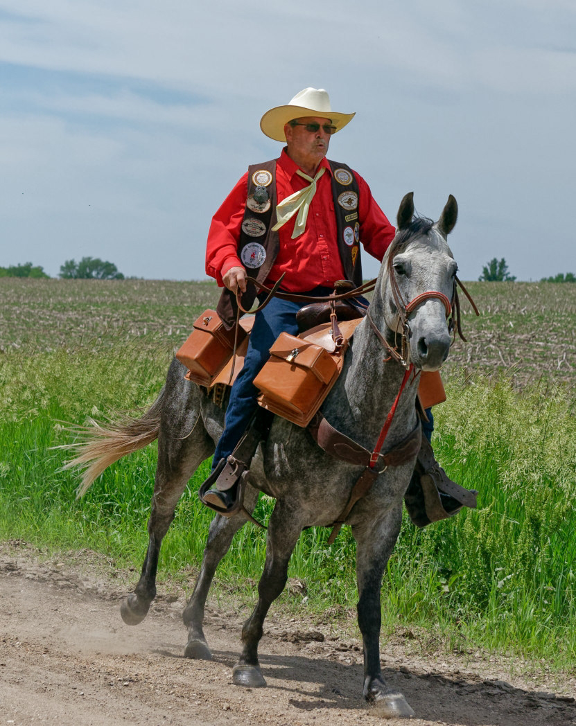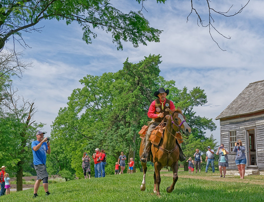 The Pony Express delivered mail between St. Joseph, Missouri and Sacramento, California for only 18 months from April 3, 1860, to October 24, 1861 when it was replaced by the telegraph. But it quickly spawned lore and legend and inspired generations even until today. The relay system of horses and riders made the 1966 mile journey in ten days carrying the mochila, a four pouch leather mail bag that fit over the saddle, through Missouri, Kansas, Nebraska, Colorado, Wyoming, Utah, Nevada, and California. The National Pony Express Association (NPEA) has helped keep the memory of the Pony Express alive by organizing a yearly "Re-Ride" that follows as closely as possible the original route. The Re-Ride is also a 10 day, 24 hours a day relay. You will see riding and transferring of the mochila as well as spectators and spectacular landscapes. The groups with riders often included multi-generation families, friends, and children waiting to become old enough to take their turn carrying the mochila. In 2019 the Re-Ride began in St. Joseph first with the swearing in of the riders with the original oath: "I, ... , do hereby swear, before the Great and Living God, that during my engagement, and while I am an employee of Russell, Majors, and Waddell, I will, under no circumstances, use profane language, that I will drink no intoxicating liquors, that I will not quarrel or fight with any other employee of the firm, and that in every respect I will conduct myself honestly, be faithful to my duties, and so direct all my acts as to win the confidence of my employers, so help me God." In the summer of 2019, my wife and I followed the Re-Ride from St. Joseph to Sacramento. A story I wrote for the NPEA may be found at: https://nationalponyexpress.org/annual-re-ride/reports-from-the-trail/. The Re-Ride dashed from the historic Pony Express Office at the Patee House in St. Joseph and quickly crossed the Missouri River into Kansas, where exchanges were made at other historic locations. Additional galleries are organized by state, which include all the states of the trail but Colorado, which was ridden in the dark. For more information, see: https://nationalponyexpress.org/annual-re-ride/ https://en.wikipedia.org/wiki/Pony_Express https://www.nps.gov/poex/planyourvisit/maps.htm