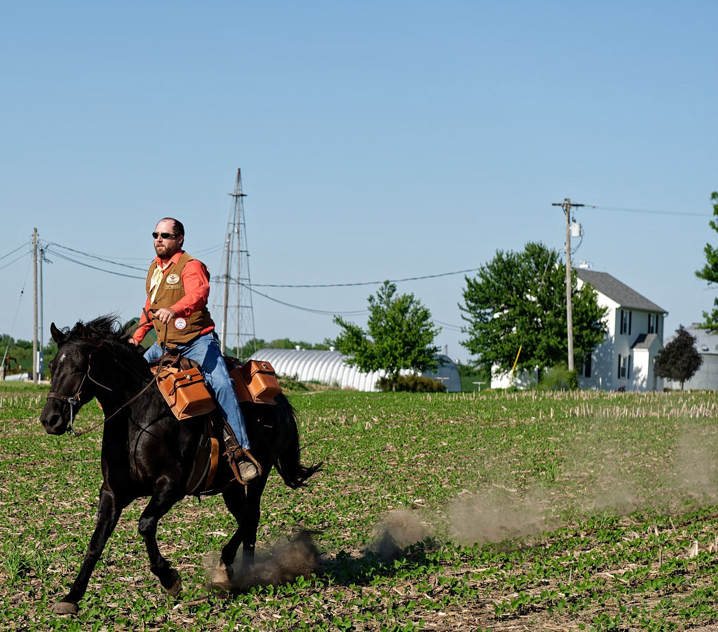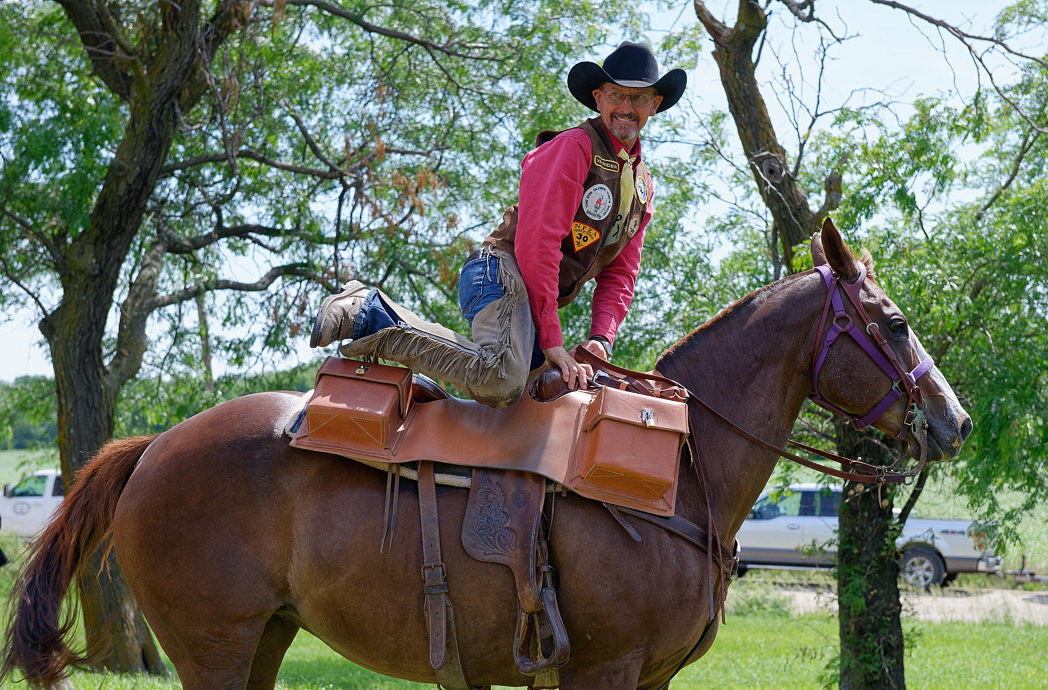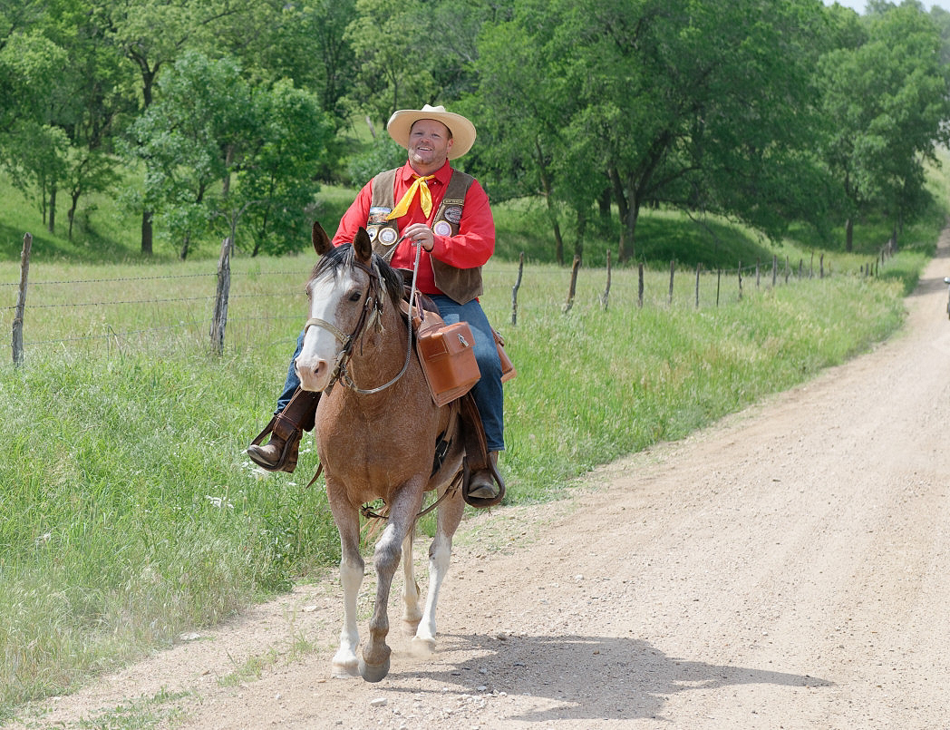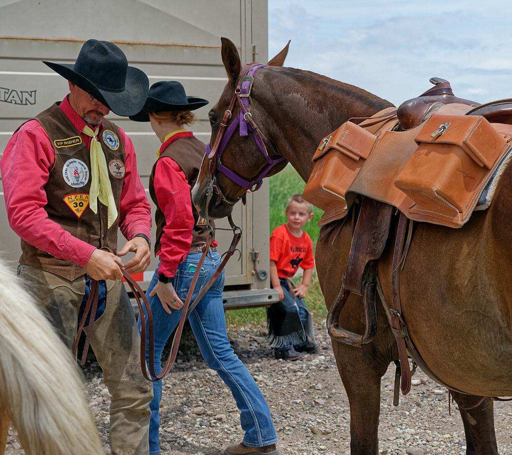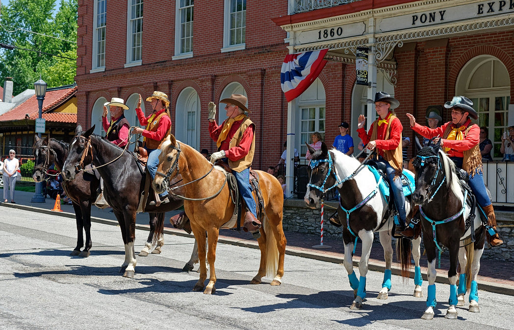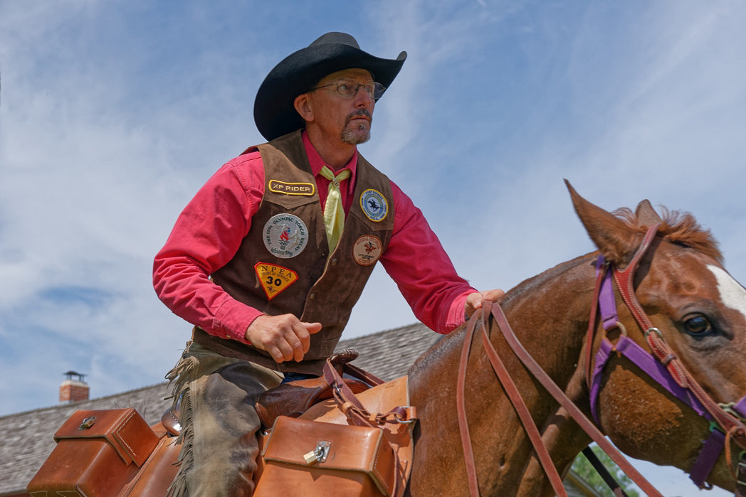The Pony Express delivered mail between St. Joseph, Missouri and Sacramento, California for only 18 months from April 3, 1860, to October 24, 1861 when it was replaced by the telegraph. But it quickly spawned lore and legend and inspired generations even until today. The relay system of horses and riders made the 1966 mile journey in ten days carrying the mochila, a four pouch leather mail bag that fit over the saddle, through Missouri, Kansas, Nebraska, Colorado, Wyoming, Utah, Nevada, and California. The National Pony Express Association (NPEA) has helped keep the memory of the Pony Express alive by organizing a yearly "Re-Ride" that follows as closely as possible the original route. The Re-Ride is also a 10 day, 24 hours a day relay. You will see riding and transferring of the mochila as well as spectators and spectacular landscapes. The groups with riders often included multi-generation families, friends, and children waiting to become old enough to take their turn carrying the mochila. In 2019 the Re-Ride began in St. Joseph first with the swearing in of the riders with the original oath: "I, ... , do hereby swear, before the Great and Living God, that during my engagement, and while I am an employee of Russell, Majors, and Waddell, I will, under no circumstances, use profane language, that I will drink no intoxicating liquors, that I will not quarrel or fight with any other employee of the firm, and that in every respect I will conduct myself honestly, be faithful to my duties, and so direct all my acts as to win the confidence of my employers, so help me God." In the summer of 2019, my wife and I followed the Re-Ride from St. Joseph to Sacramento. A story I wrote for the NPEA may be found at: https://nationalponyexpress.org/annual-re-ride/reports-from-the-trail/. The Re-Ride dashed from the historic Pony Express Office at the Patee House in St. Joseph and quickly crossed the Missouri River into Kansas, where exchanges were made at other historic locations. Additional galleries are organized by state, which include all the states of the trail but Colorado, which was ridden in the dark. For more information, see: https://nationalponyexpress.org/annual-re-ride/ https://en.wikipedia.org/wiki/Pony_Express https://www.nps.gov/poex/planyourvisit/maps.htm