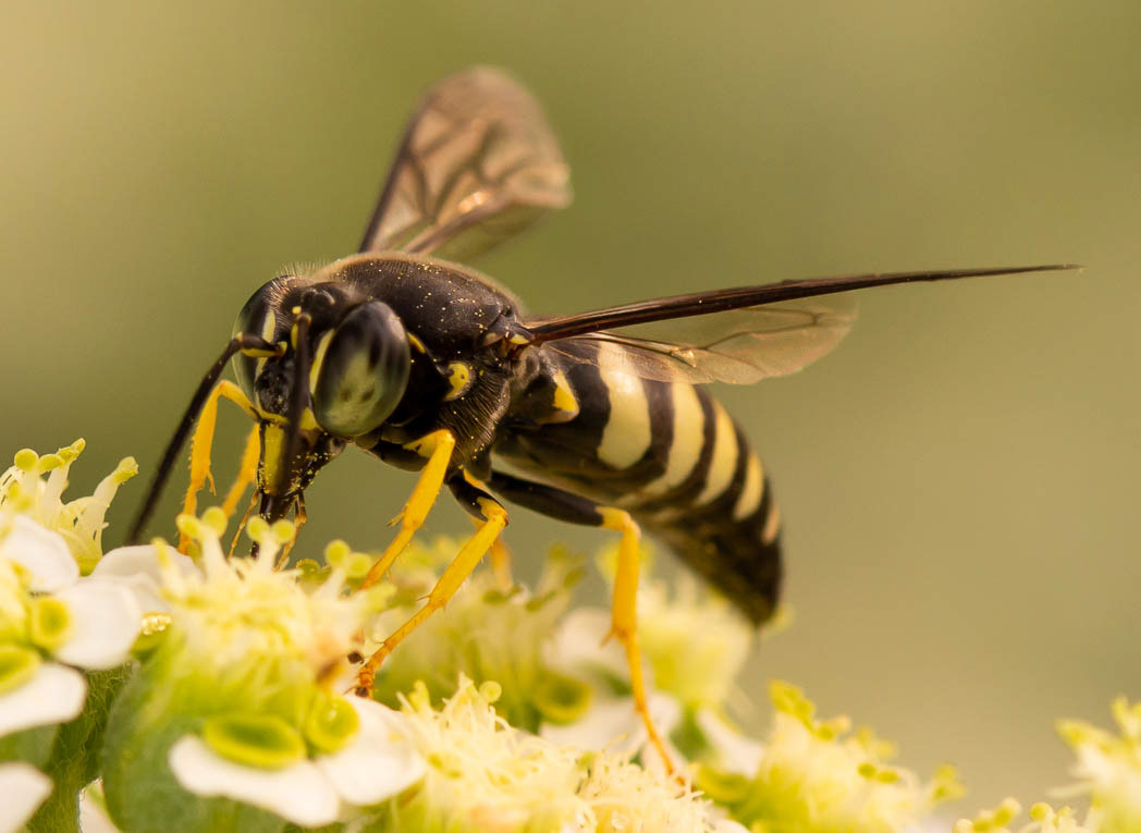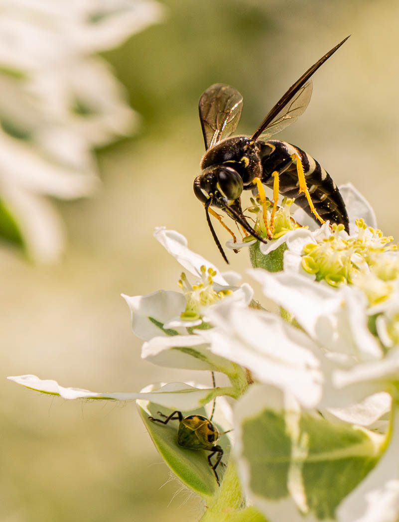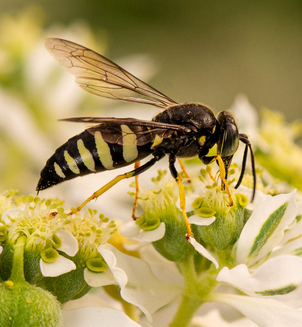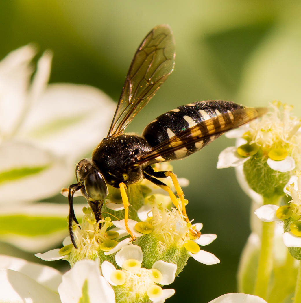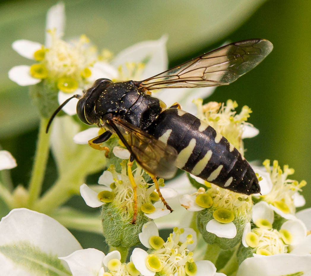 The Sand Wasp (Bicyrtes quadrifasciatus), also called Stink Bug Hunter, burrows in sand as you might have guessed. They sometimes catch other bugs, but their favorite prey is the stink bug nymph, especially those of the brown marmorated stink bug, which is an invasive species from Asia. The female paralyzes about a dozen to place in her burrow and lays one egg with them. She then covers the entrance. The larva that hatches eats the nymphs. As with most solitary wasps, they are not aggressive toward people. If you don't like stink bugs, you should find out how to attract the Sand Wasp to your yard. The adults are pollinators as they are sustained by the nectar of flowers. There are over 1,200 species of the Sand Wasp. Many are black and white or black and yellow like those shown here.