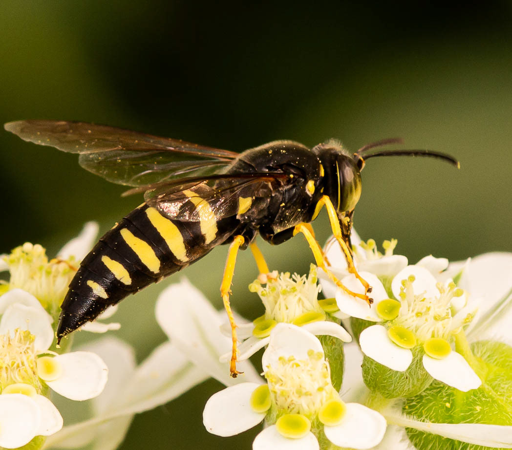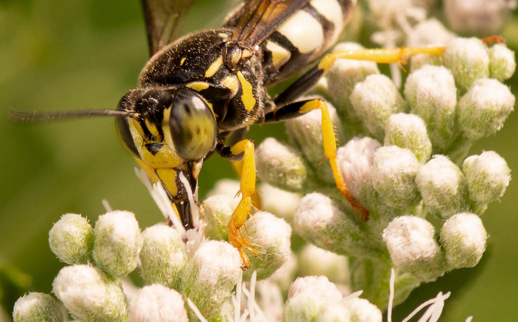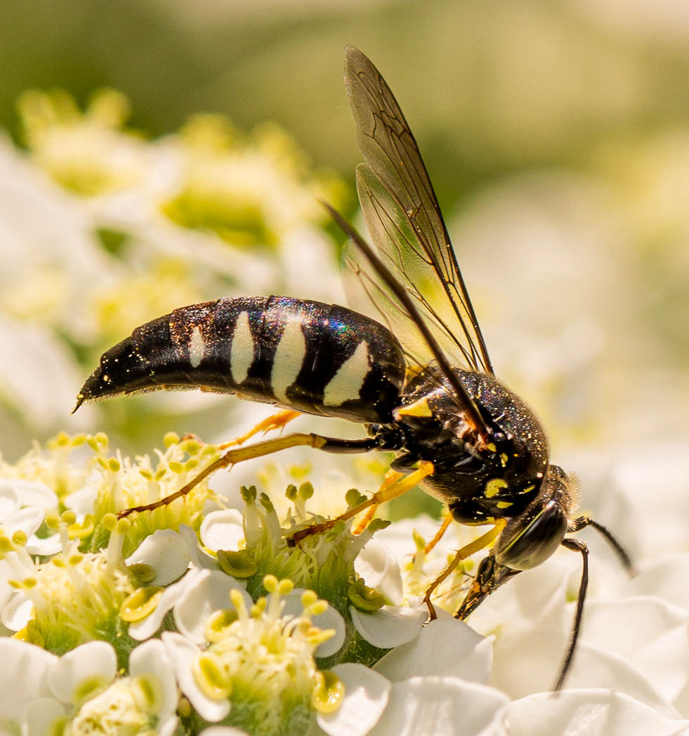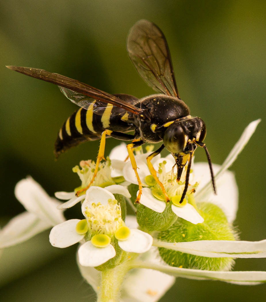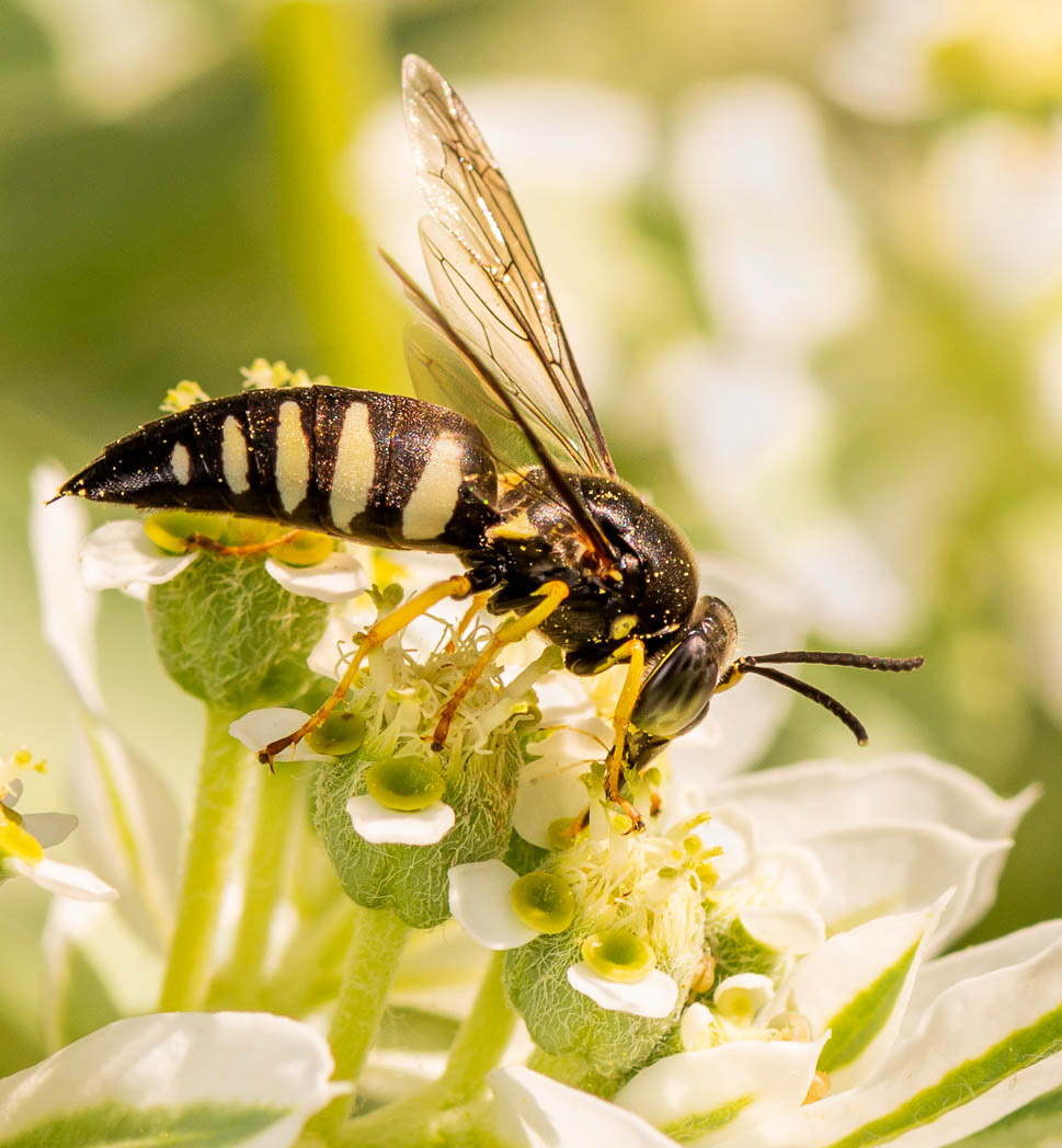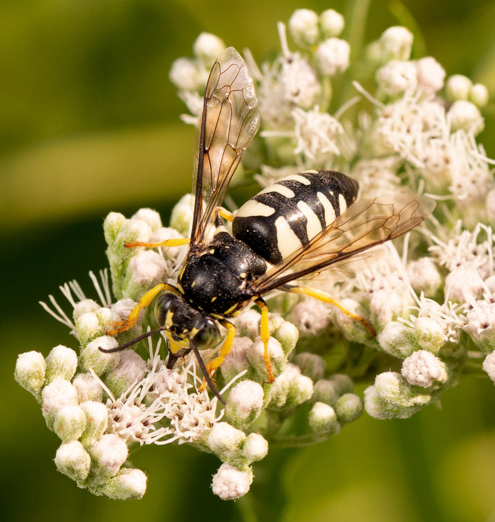 The Sand Wasp (Bicyrtes quadrifasciatus), also called Stink Bug Hunter, burrows in sand as you might have guessed. They sometimes catch other bugs, but their favorite prey is the stink bug nymph, especially those of the brown marmorated stink bug, which is an invasive species from Asia. The female paralyzes about a dozen to place in her burrow and lays one egg with them. She then covers the entrance. The larva that hatches eats the nymphs. As with most solitary wasps, they are not aggressive toward people. If you don't like stink bugs, you should find out how to attract the Sand Wasp to your yard. The adults are pollinators as they are sustained by the nectar of flowers. There are over 1,200 species of the Sand Wasp. Many are black and white or black and yellow like those shown here.