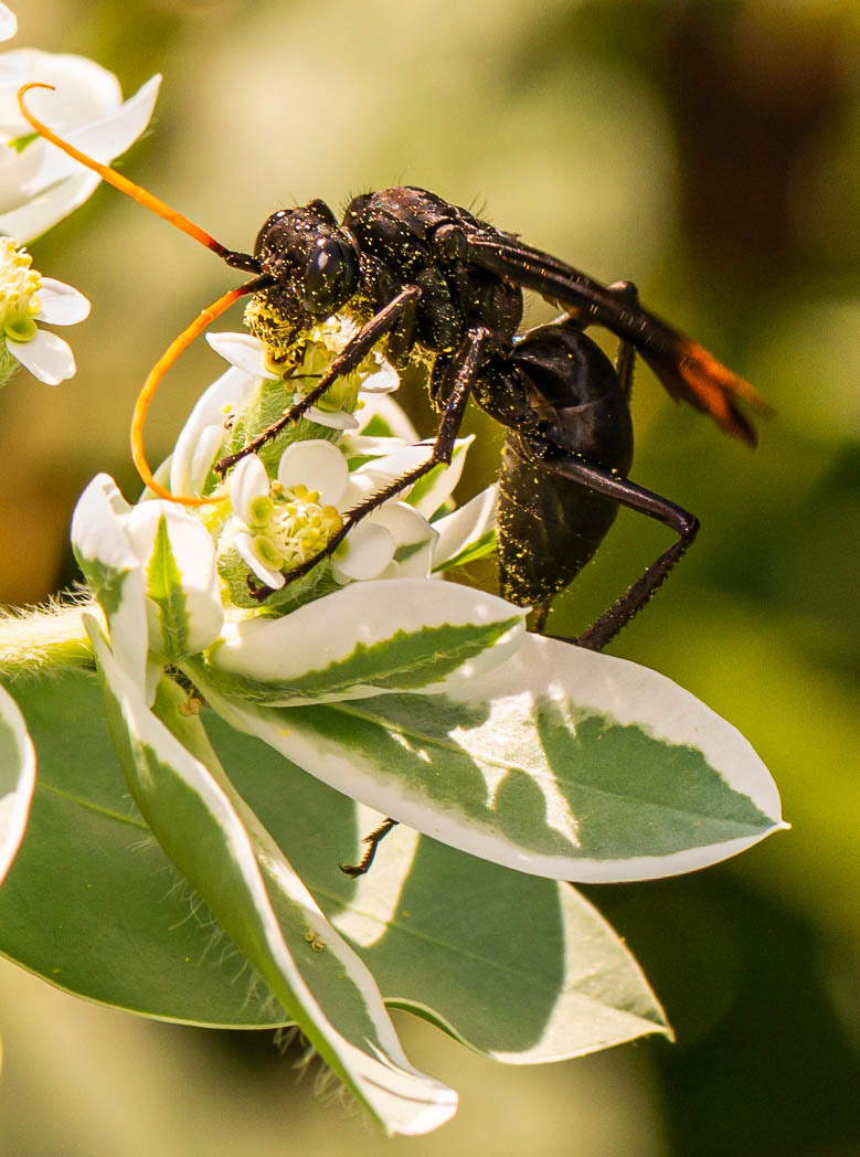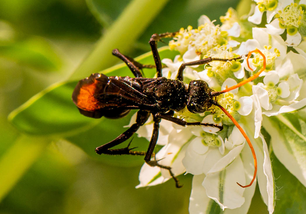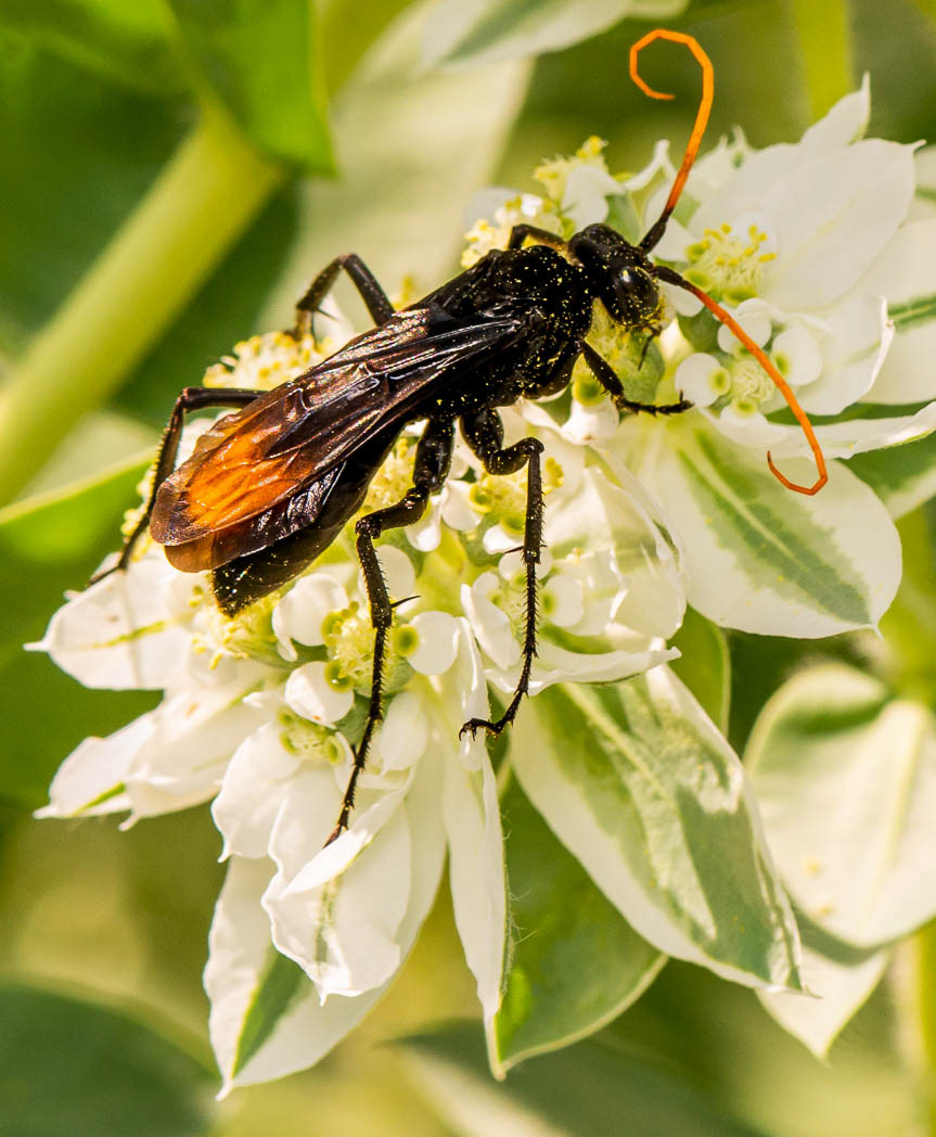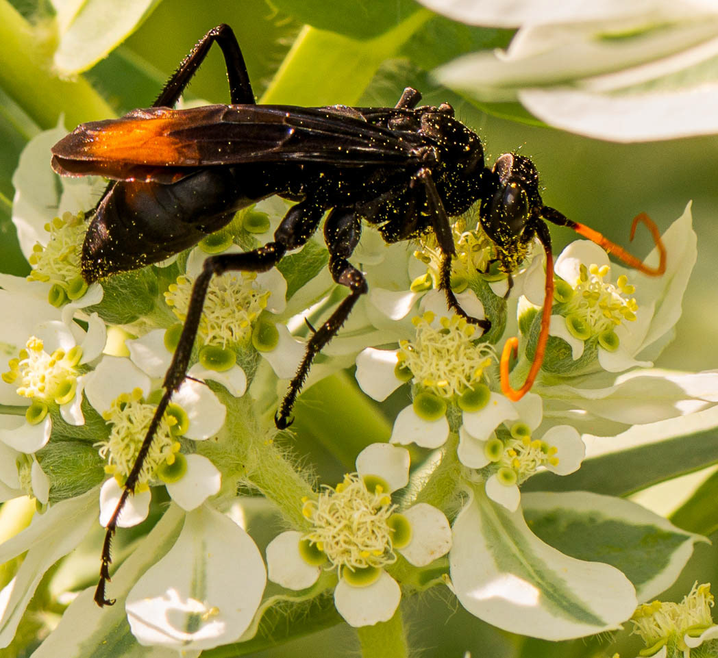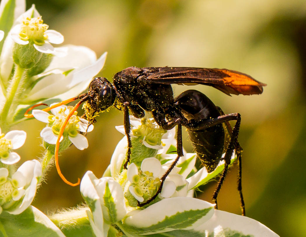 This (Entypus Unifasciatus) is one of the Spider Wasps. It is a fairly large wasp sometimes as long as one and one-quarter inches not counting legs and antenna. The adults dine on flower nectar and pollen. The female hunts spiders, usually wolf spiders, stinging to paralyze the spider so that she can drag it backwards often a considerable distance to an underground spot that had been carved out by another animal. The wasp would have already dug a chamber off the main enclosure in preparation for bringing and inserting the spider and laying one egg on one large spider. The female Spider Wasp repeats this procedure many times, which makes her tattered and worn by September. The larva eats the spider, spends the winter there, and emerges in the spring. There is one generation per year.