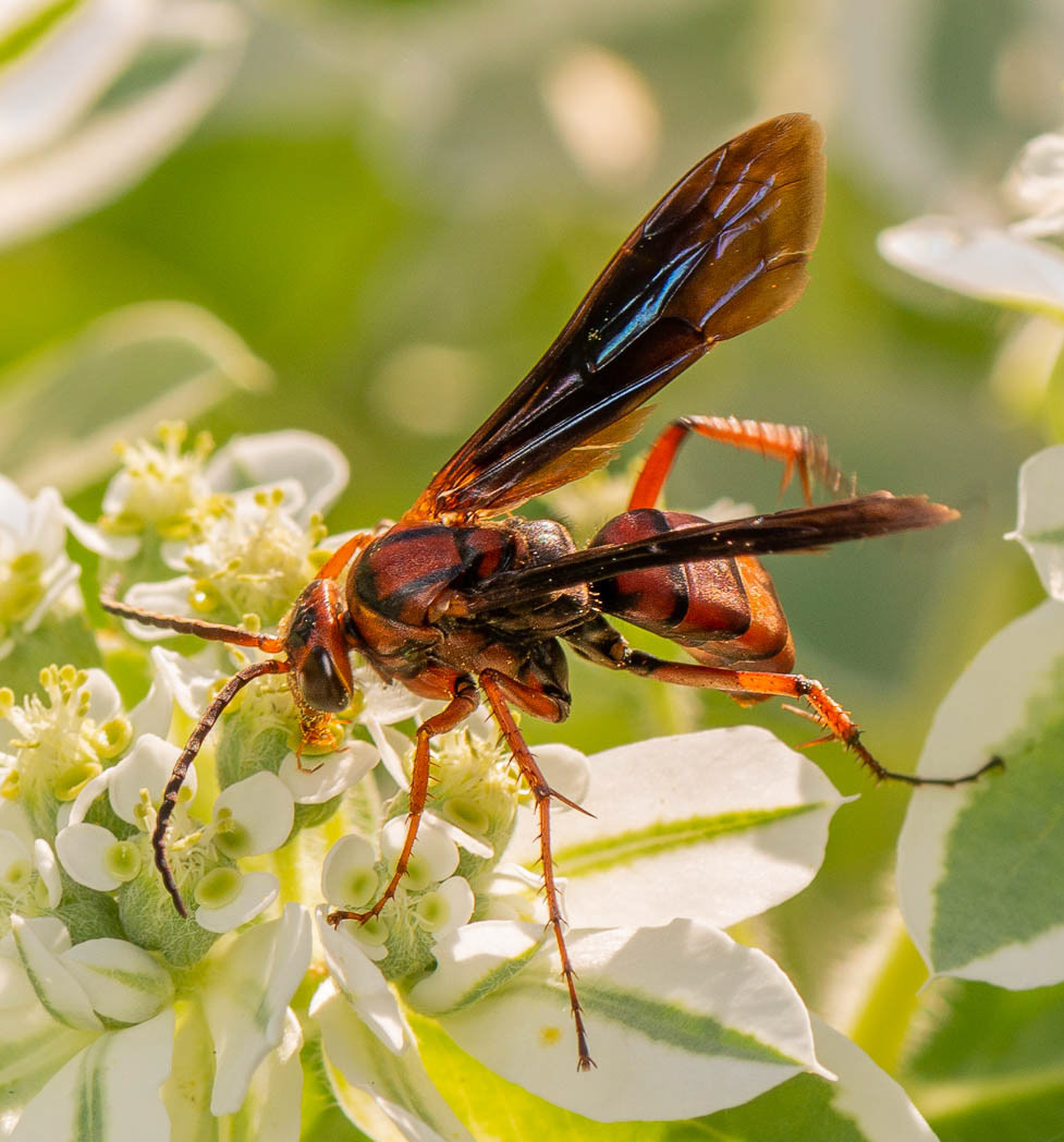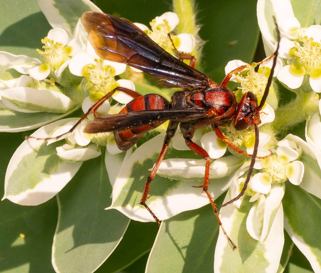 Probably of the sub-species coquilletti, this wasp paralyzes a spider with its sting and places it in a chamber with one of its eggs to nourish the larva after the egg hatches. Orb weaver spiders are favored, but the female will switch to others as needed. Like its close relative, Poecilopompilus Interruptus (see the previous gallery), it mimics other stinging wasps to warn other critters. It is also a solitary wasp that is not aggressive toward people who do not disturb it. This sometimes makes it hard to identify or even distinguish it from Poecilopompilus Interruptus. The female digs a tunnel to make a nest in the ground after dragging a spider to the site backwards. She then fills the tunnel and may place debris over the covered entrance.