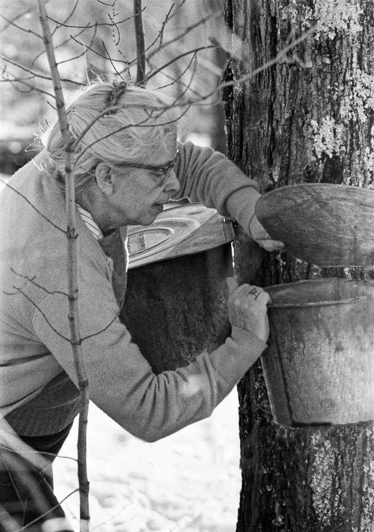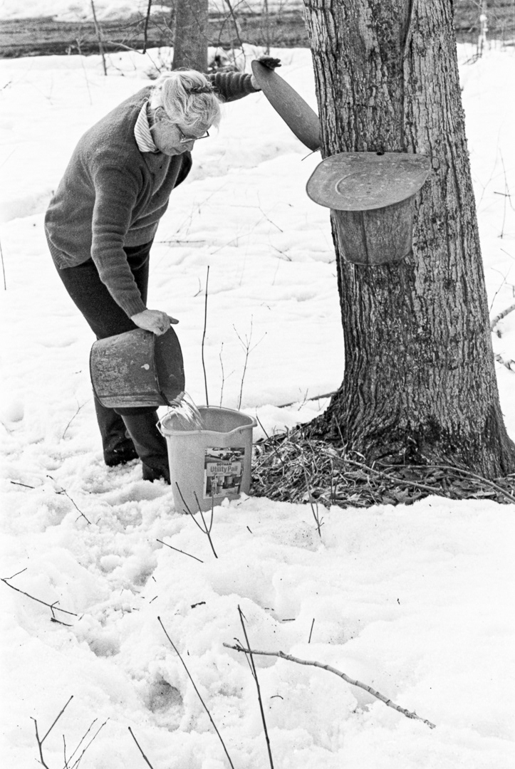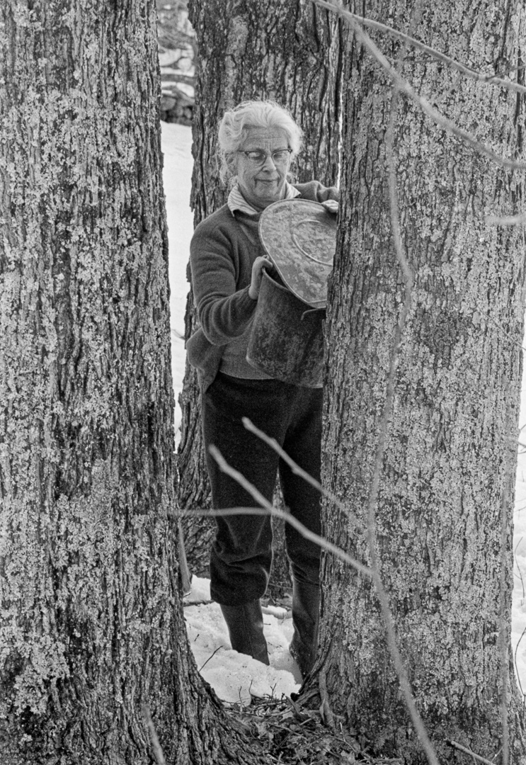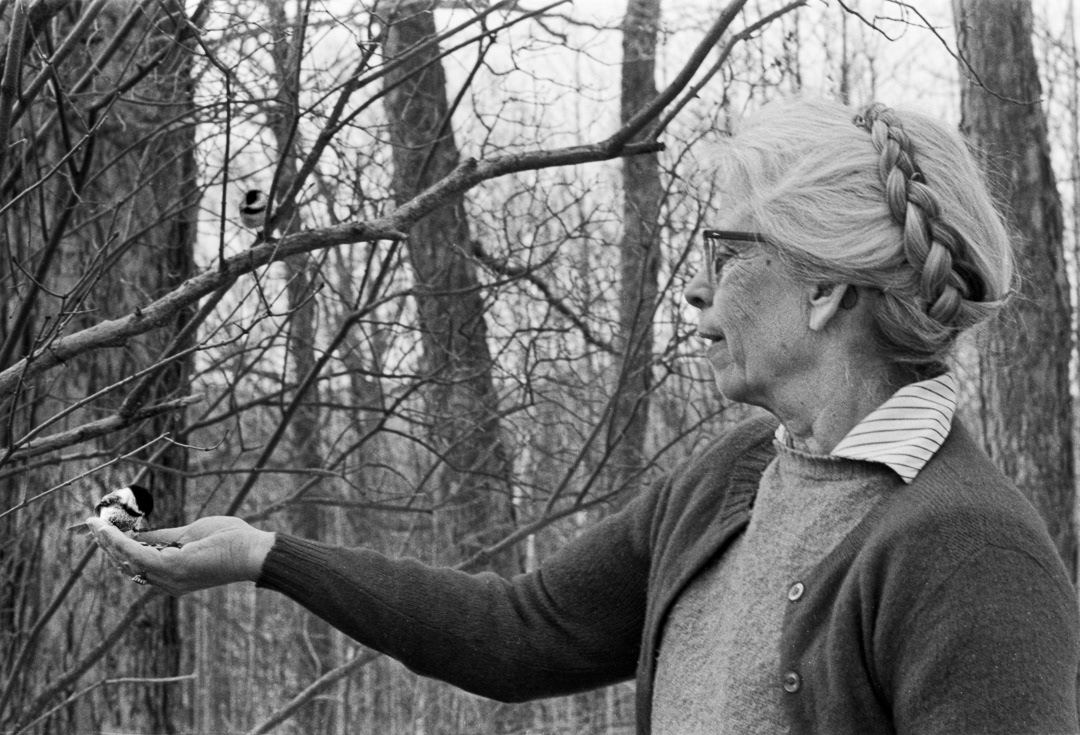 Ruth Whittemore, pictured here, grew up at Maple Grove Farm in Lyme, New Hampshire, where she and her sister, Polly, gathered maple sap at the end of each winter when the temperature would rise above freezing during the day. From the sap they made maple sugar candy. It takes 30-50 gallons of sap to make one gallon of syrup, which weighs 11 pounds. One gallon of syrup will make eight pounds of candy. Ruth and Polly also fed the chickadees, who perched on their fingers and ate seeds from their hands. In the last photograph, you can see one chickadee eating from her hand and another waiting on a tree limb for its turn.
