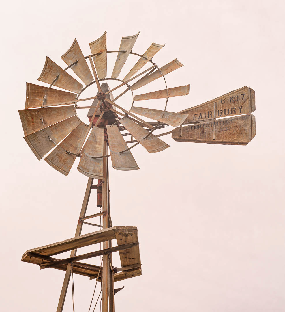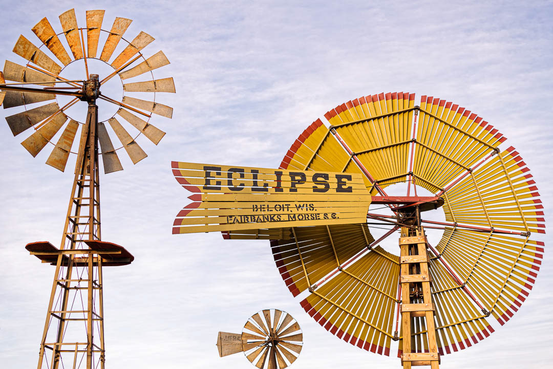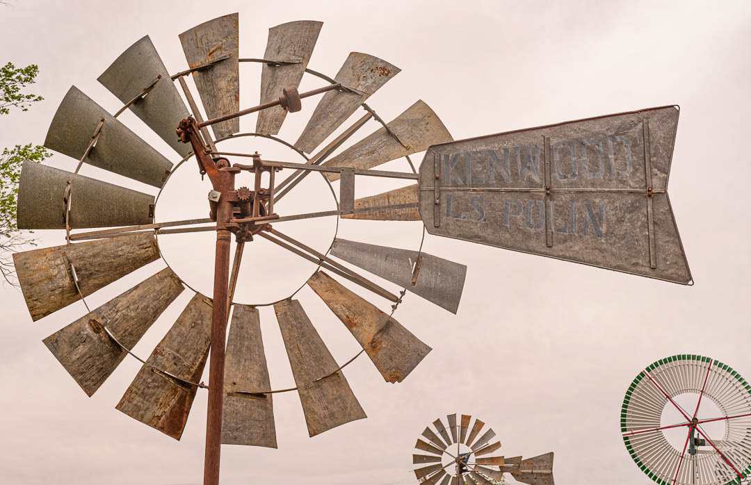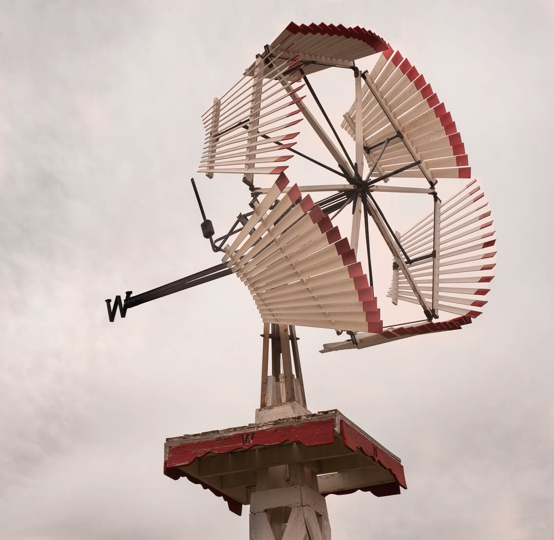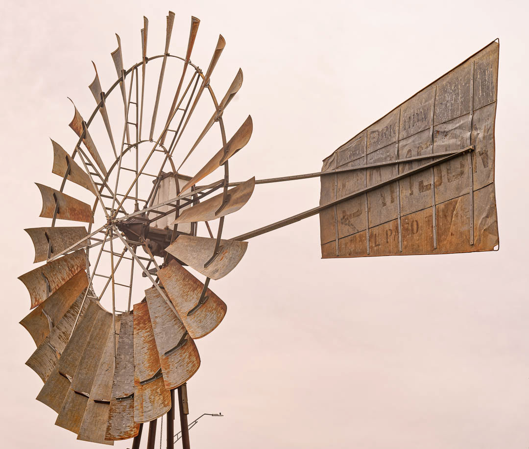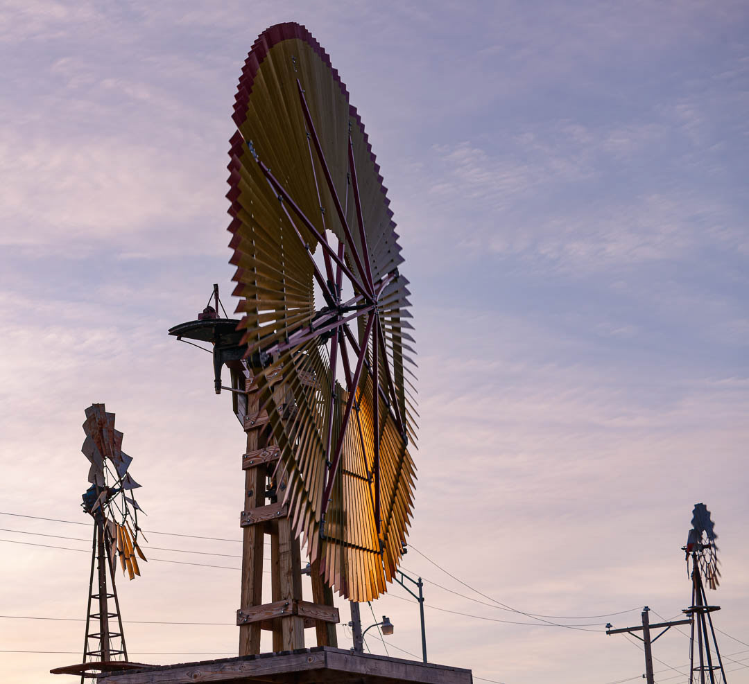 Windmills can be seen all over the American midwest and west. The Shattuck Windmill Museum in Shattuck, Oklahoma, has collected 37 different windmills and some related equipment. They range in diameter from five to eighteen feet. The windmills are all in working order and have served on a farm or ranch. This American-style windmill was invented in 1854, and it played an essential role in the settlement of the American high plains. The electrically powered pump gradually replaced many of the windmills beginning in the 1930s, but windmills saw a resurgence in the 1970s when electricity prices increased sharply. Many functioning windmills can be seen today watering gardens and providing a favorite meeting place for cows. I took these photographs in 2021.