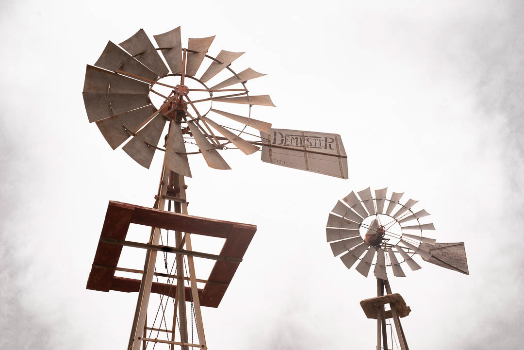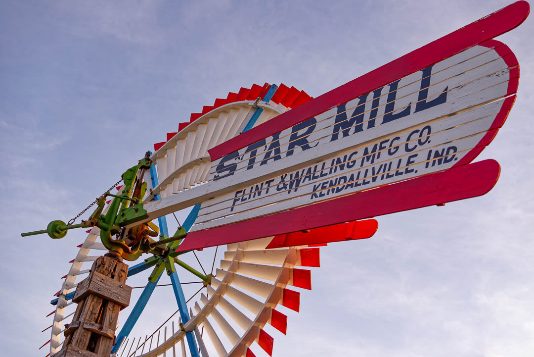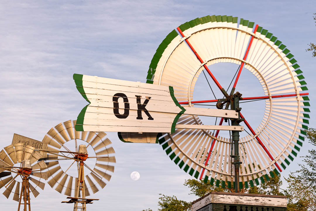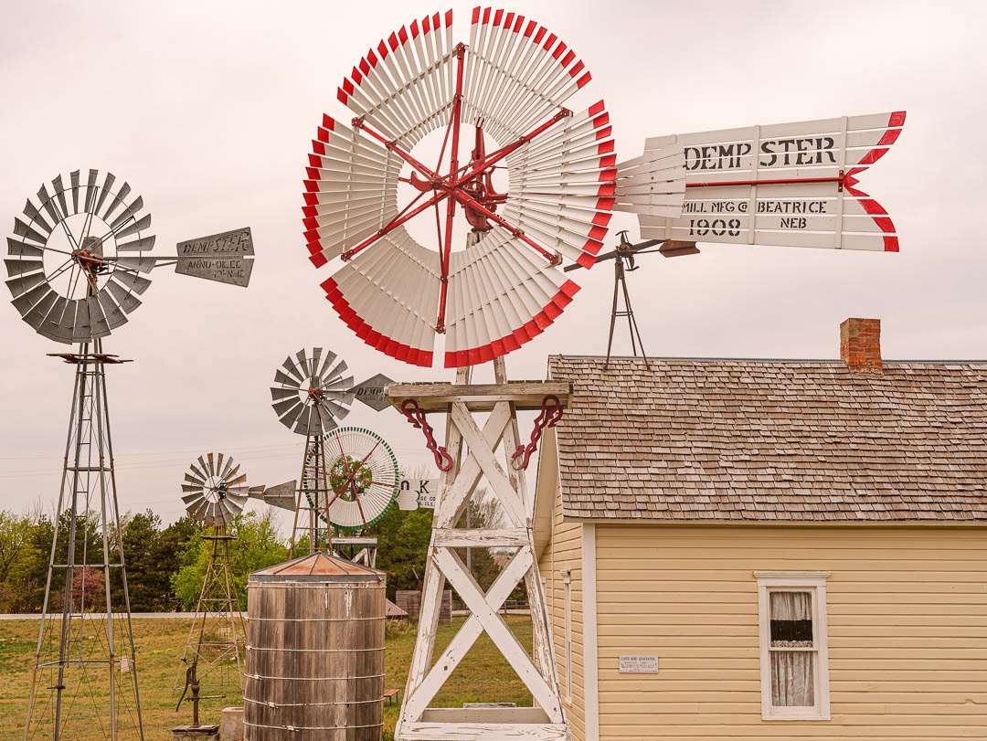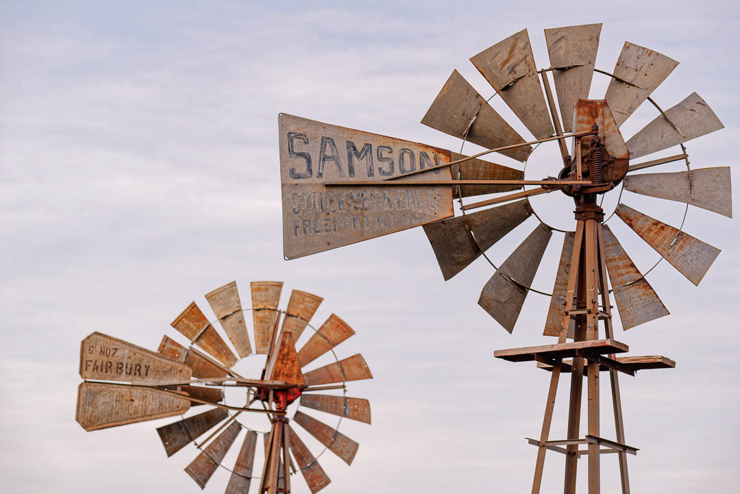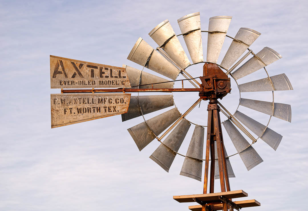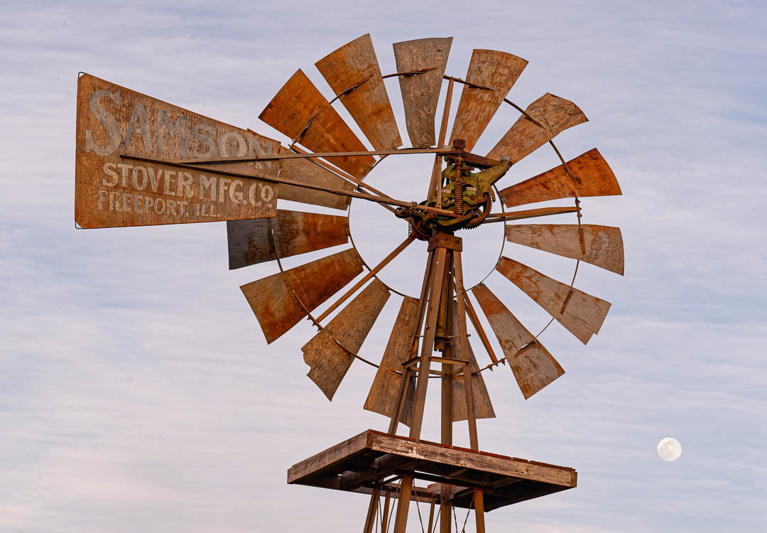 Windmills can be seen all over the American midwest and west. The Shattuck Windmill Museum in Shattuck, Oklahoma, has collected 37 different windmills and some related equipment. They range in diameter from five to eighteen feet. The windmills are all in working order and have served on a farm or ranch. This American-style windmill was invented in 1854, and it played an essential role in the settlement of the American high plains. The electrically powered pump gradually replaced many of the windmills beginning in the 1930s, but windmills saw a resurgence in the 1970s when electricity prices increased sharply. Many functioning windmills can be seen today watering gardens and providing a favorite meeting place for cows. I took these photographs in 2021.